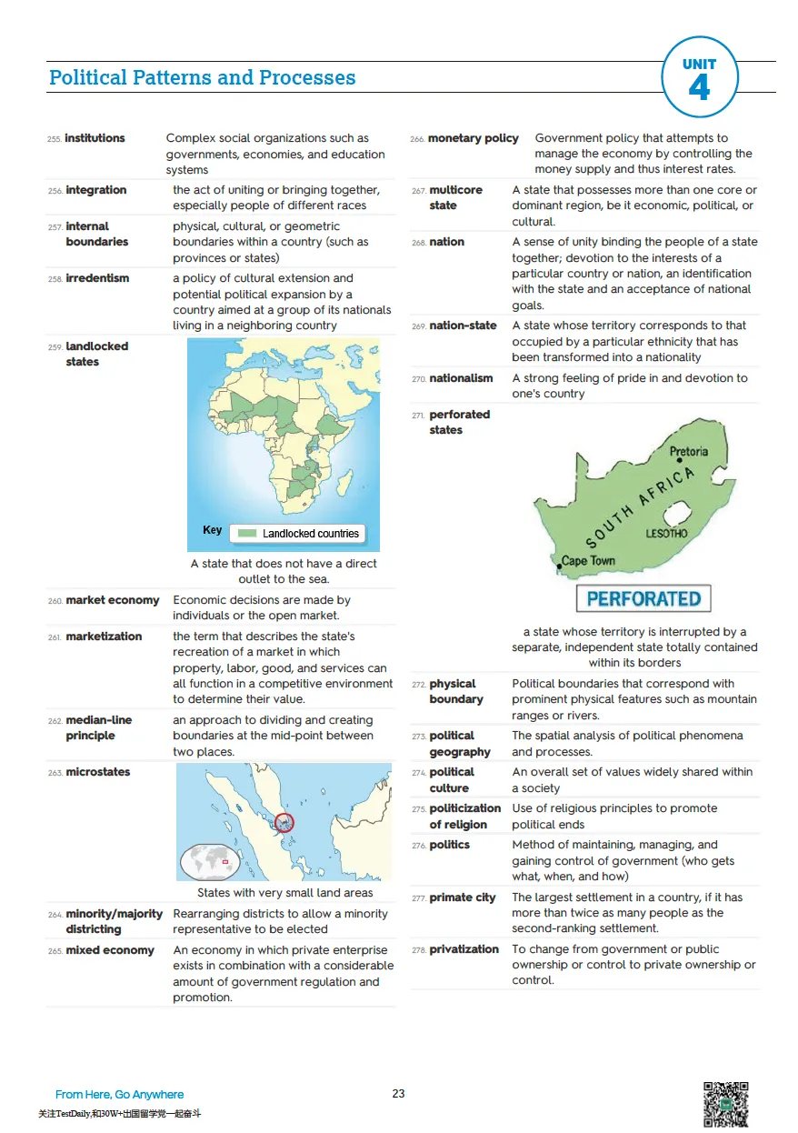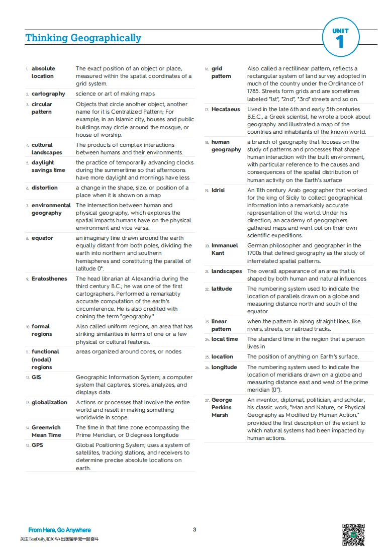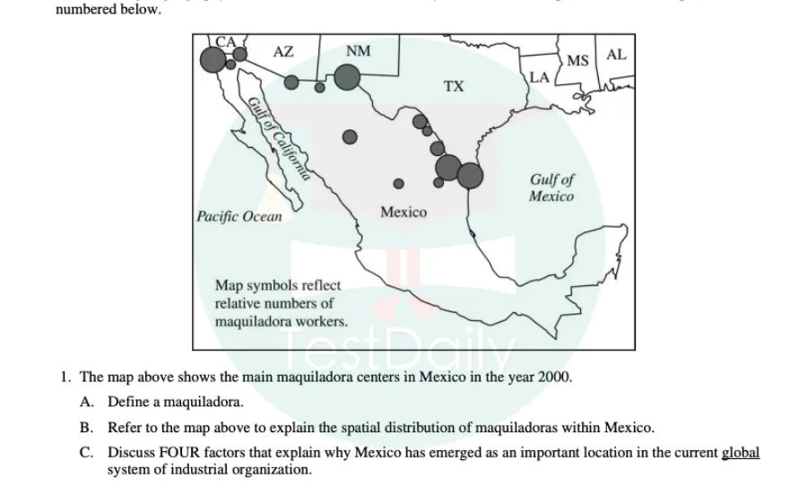 天气与气候,气温和降水,地球五带的分布,如果大家在初中中考体系中学习过地理,想必对这些词语并不陌生。但是,人文地理的内容远远不止于此。人文地理主要是在学习人类与地理环境的关系,强调的是“人文”。比如,人文地理的第二单元会学习不同的移民方式、人口增长的过程;第三单元,会学习不同地区的宗教和语言分布;第六单元,会学习城市发展进程的不同模型。这个学科可以让我们更好地了解世界,开拓眼界。回归到考试本身,人文地理考试分为两个部分,选择题和问答题。这一门科目不同于理科,重点在于理解性背诵。那么到底该如何准备这两部分呢?接下来我会为大家详细讲解。我学习人文地理一共花费了九个月的时间,学校有开设这门课,所以我就跟着学校的进度来安排学习。一般来说,我是一个月学习一个单元,剩下的两个月用在总体的复习上。平时除了上课听课,我还会在每周的周末抽出一到两个小时来复习自己学过的内容。首先,认真看课本,记忆理解书中的概念,并划下重点;其次,做reading notes,主要是记录重要的概念、定义、例子,但是在记录定义的时候,我不会直接抄写书中的概念,而是会根据自己的理解进行一个转述,转述概念的过程可以帮助我们更好地消化知识。一般学习完一个单元,我会做对应的FRQ和MCQ练习,从而巩固所学知识。TD人文地理课程中配套的练习册就囊括了往年的真题,这是一个非常好的练习素材。熟知概念可以帮助我们更好地应对选择题,选择题一般考察的是大家对于一个概念的理解,所以只要我们对相关概念做到心中有数,做好选择题就不难;问答题则会复杂一点,会考察大家对概念的理解及是否有相关的例子来解释对应的概念。接下来我们以一道题为例来看一下问答题的具体考察方式:这道题的A问就是在问maquiladora概念的定义,那我们的回答可以是:Maquiladora is a foreign-owned plant located in Mexico. It has the advantage of cheap labor. It exports assembled products to the US and imports product components from the US.B问则是在考察我们在学习这个概念时,是否对墨西哥的真实情况有所了解,并有相关例子来佐证。想要回答好这一类问题,在平时学习的时候,一定要多做积累,并内化成自己的知识储备。可以这样回答:Labor cost in Mexico is low. Environmental regulation is weak there. Mexico is close to the US market. There are rising transnational corporations.大家要注意做好长期备考人文地理的规划。人文地理有七个单元,虽然每一个单元在考试中的占比不尽相同,但是考试基本都会涵盖,所以大家一定要合理规划复习时间。我个人认为,大家在做备考时间规划的时候要有弹性,比较简单的单元,如第一单元,可以少花一些时间;但是对于比较难的单元,如第三单元,有关人类语言和宗教,内容比较繁杂,记忆难度较大,可以多花时间复习。在考前的一个月,我建议大家可以开始刷真题,一方面可以帮助我们逐渐找到做题的感觉;另一方面,我们也可以在做错的题目当中,发现自己的问题所在,从而可以有针对性地进行练习巩固,弥补短板。 1. The Cultural Landscape An Introduction to Human Geography我在开始学习人文地理的时候,除了上TD的人文地理课,还会看 The Cultural Landscape An Introduction to Human Geography 这本书。这本书将现实生活和书本概念相结合,两者充分融合在一起,让我们可以更深入地理解相关概念,同时,也可以关注、记忆书中的例子,以此作为我们写FRQ的内容。如果没有时间看整本书的话,我推荐大家一个国外的网站资源:https://fiveable.me/ap-hug这个网站内有不同AP学科的总结性内容,有些学科的内容并不完整,但是我觉得人文地理这个学科做的还是很完善的,可以帮助我们有的放矢抓住学习重点。或者,去Google 一些AP Human Geography review,可以搜索到一些其他人总结好的内容,根据自己的实际情况有选择性的去使用。YouTube上会有一些有关人文地理unit review的视频,我们可以通过这些资源进行辅助性学习,对于一些不太理解的概念也可以在YouTube上搜索相关的解释性视频,帮助理解。此外,Google上有很多关于AP Human Geography 的practice test,大家可以利用这些资源多多练习,从而巩固自己的知识。人文地理中涉及到的概念很多,也需要掌握诸多相关例子,因此,想达到5分的水平需要日积月累,靠临时抱佛脚很难获得一个理想分数。在很多情况下,我们连续学习一个小时人文地理可能还没有每天用六个十分钟的碎片时间来学习达到的效果好,所以大家可以多多利用碎片时间去背诵概念、例子。我不止一次听到一些小伙伴说,他们一紧张考试就容易失利,会害怕考试的时候大脑空白,完全忘记自己背过的知识。在这里,我想跟大家说,人类的紧张是有两面性的,适度的紧张可以让我们更加专注在自己需要完成的事情上。所以,大家考试前如果感到很紧张的话,不妨多去考虑一下自己在考试中应该注意的要点,而不是一直担心“害怕忘记背过的概念”这种影响精神状态的事情。综上,便是我备考AP人文地理的经验分享了,希望大家可以从中有所收获。其实,这个学科大家只要愿意花时间学习,一般都可以考到一个很好的分数,所以,也不用过于焦虑。最后,希望大家备考顺利,取得理想的AP分数,助力申请!撸起袖子加油学吧!小编在上文中多次提到AP人文地理需要记忆很多专业概念及例子,但只有看懂专业的英文术语,才能进行下一步的理解背诵