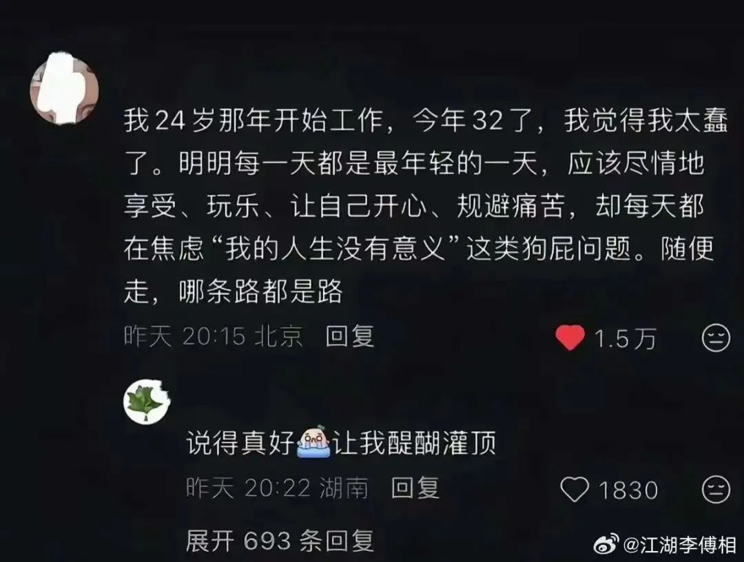 听了鲁豫对话李银河那期岩中花述,鲁豫问,怎么看待个人改变不了社会而带来的落差感,李银河说不能把生命的意义寄托在改变社会上,因为对于宏观的宇宙来说,生命是没有意义的,但是在微观上来说,生命的意义就是两条——身体的舒适和精神的愉悦。