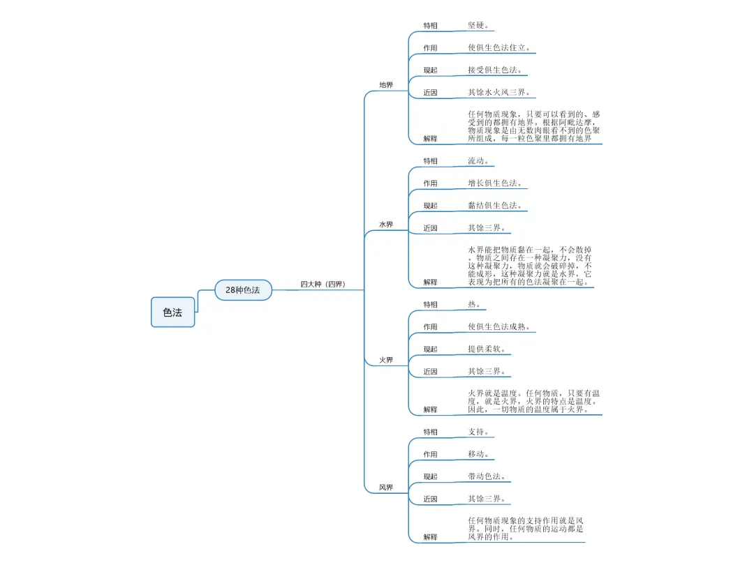 地、水、火、风四界存在于一切物质现象,是所有物质现象都存在的物质属性。此四界互相作用,互相依存。其中,四界立足于地界,由地界支撑着,由水界黏在一起,由火界维持,由风界支持。就以杯子为例,杯子的形状以地界为主,表现为坚硬性;它能够黏在一起不会散掉,是水界的作用;它的温度是火界;支持杯子不倒是风界的作用,它能够被移动也是风界的作用。