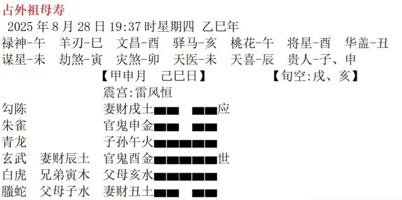 先介绍一下相关背景:2025年外婆已93岁高龄,整个8月几乎一直感冒并伴有咳嗽如此反反复复,去医院看病时,诊断为肺部有炎症,但也只给开消炎药不给打吊瓶留院治疗,让回家疗养。占卦前几日竟见末日光景,占卦前一日找一神家(出马仙)看是什么情况,神家言外婆的2个“姥姥”跟在身上,现在是一个坎,并让买寿衣冲一冲,母亲及姨妈几人随生问寿元之念(怀疑近期外婆便会有不测)。因本人在外地工作,接母亲电话后知道情况后,自身并无起卦的想法,随即摇出此卦。因摇卦人无主动摇卦的想法,而为代他人摇卦,此类卦为被动性代占。世爻代表的并非摇卦人,而是起摇卦意念的人,我摇此卦只是母亲借我之手而已。卦题虽为“占外祖母寿”,实际上应为“问母亲寿元”。按卦题应是应期卦,但卦显却没有应期的特征,反而事卦特征更为明显。因应期卦往往有动爻,而此卦中用神旺相旬空暗动。用神父母亥水带白虎,白虎为病,即可取为用神。按事卦此卦定性非常简单,为常用套路之一,仅凭占病而用神旬空即可断短期无事。本人也是按事卦解卦回复母亲外婆短期之内不会有事。9月上旬回家看望外婆时已恢复往如昨。截止写此文时,外婆身体虽不如往日,但精神状态仍好。下面分析一些细节信息:静卦恒,代表此状态已有一段时间,下步事态发展仍会维持此状态。用神带白虎,白虎为病、为咳,白虎水亦可代表感冒。以上信息均可对应现状。世爻玄武持世,即有自己的主观认定或私下的想法,主观认定为何?心念爻为妻财辰土,是用神父母亥水的墓,即主观认为外婆很可能过不了这个坎。以上是关于此卦的解读。关于神婆的做法如何解释?冲往往是采取“冲喜”的方式,而不会采取寓意不好的方式。倪海厦老师曾在《天纪》中讲过“应象”的方式来化解不利,或许是如此原理。至于有2个“姥姥”跟在身上之类则超出了术数的范畴,无从考究了。年前就更新到此吧,也借此机会给大家拜个早年,祝诸位丙午年“龙马精神,一马当先”,“自天佑之,吉无不利”!