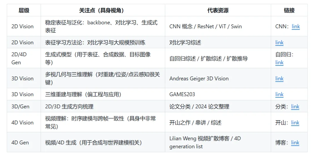 ,以及它是否能与几何(深度/点云)和语言(指令/目标)对齐。本节将视觉按“2D → 3D → 4D(视频/时序)→ Prompting/可供性”串起来,便于你形成一条连续的学习路线