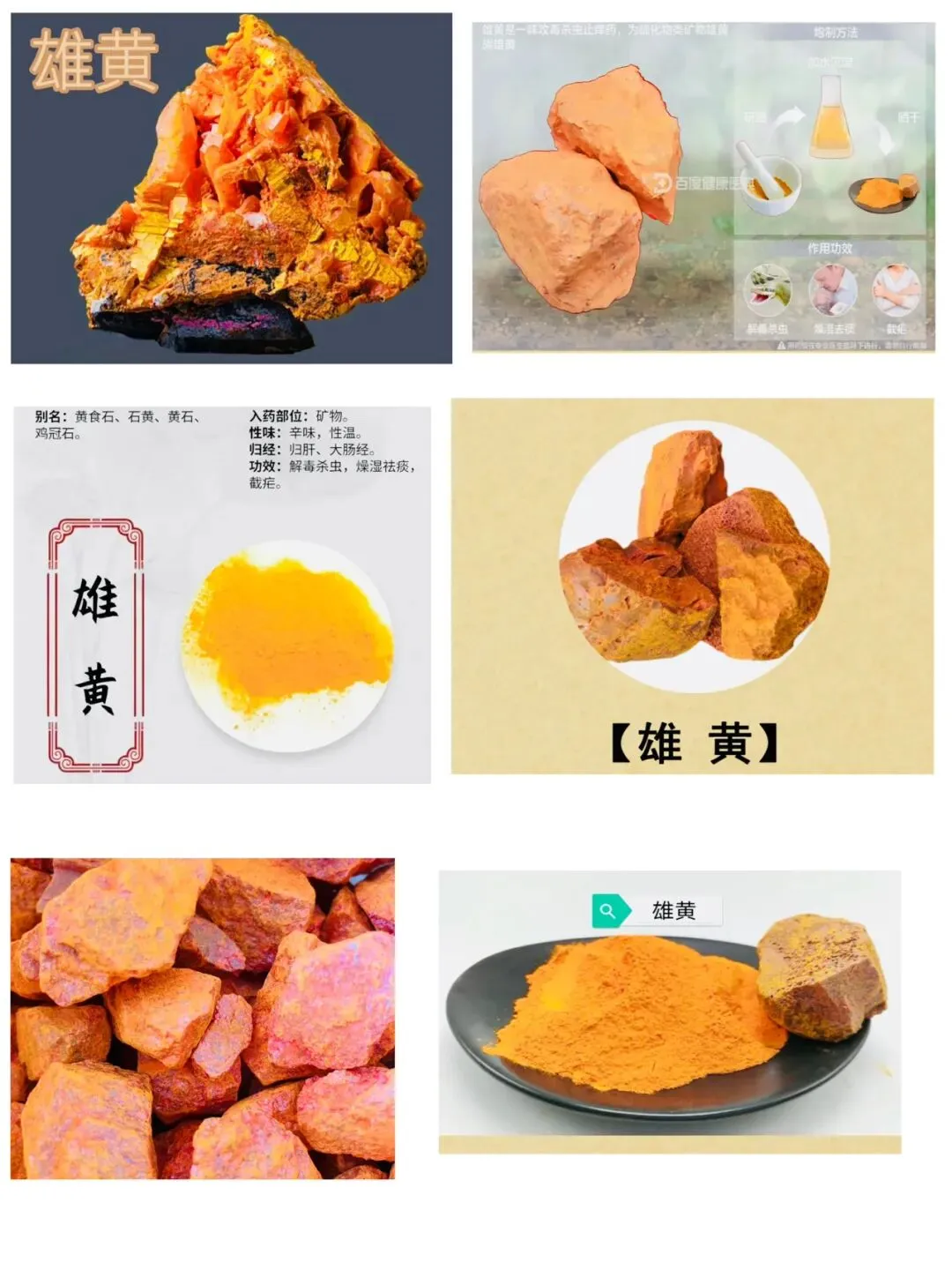 (5)联想记忆:雄黄是端午节驱虫辟邪的符号,其辛温燥烈之性确能杀毒虫、治疮癣。燃烧后的浓烈蒜臭是其独一无二的“化学签名”。