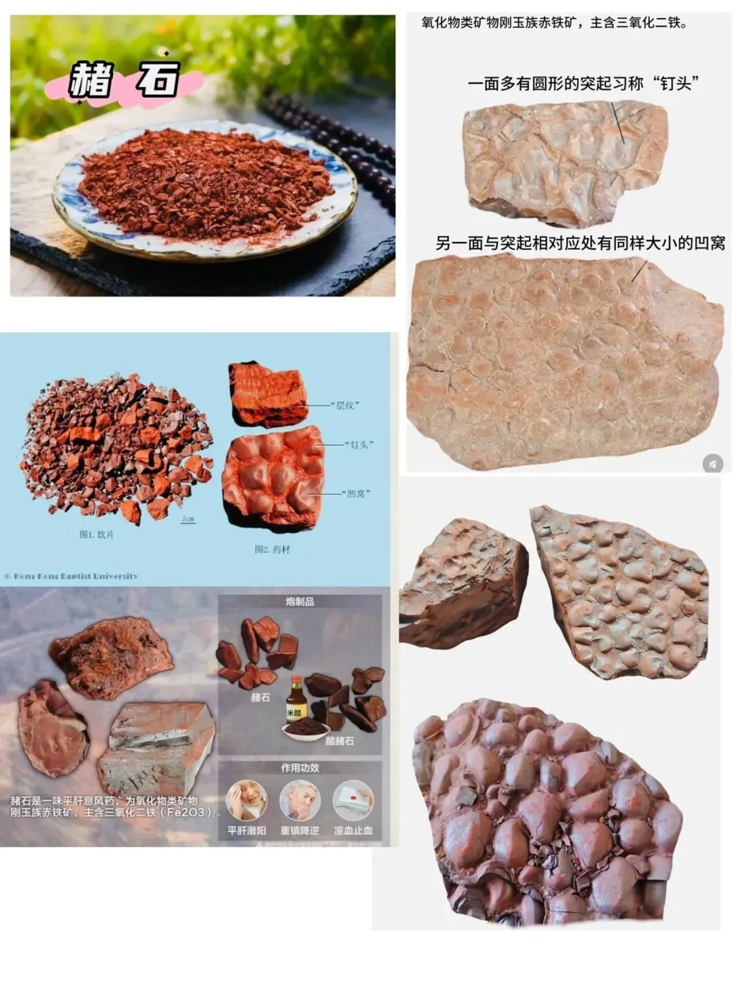 (4)联想记忆:赭石乃“铁血之石”,色红入血,质重下行,故能平降肝阳、镇逆止呕、凉血止血。“钉头赭石” 是其经典的形态描述。