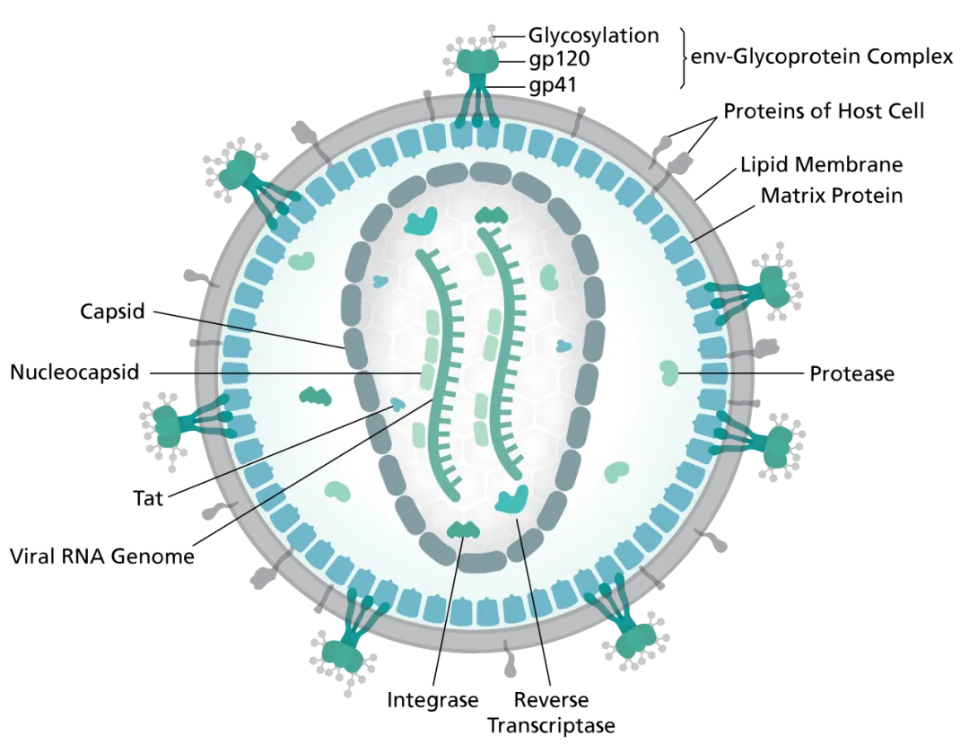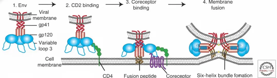 为了将病毒有效载荷递送至细胞内,由gp120和gp41亚基组成的HIV Env首先附着于宿主细胞,并与受体CD4分子结合。这导致Env发生构象变化,从而允许其与辅助受体结合,该结合部分由Env的V3环介导。随后,gp41的融合肽插入靶细胞膜,启动膜融合过程,最终形成六螺旋束并完成膜融合。