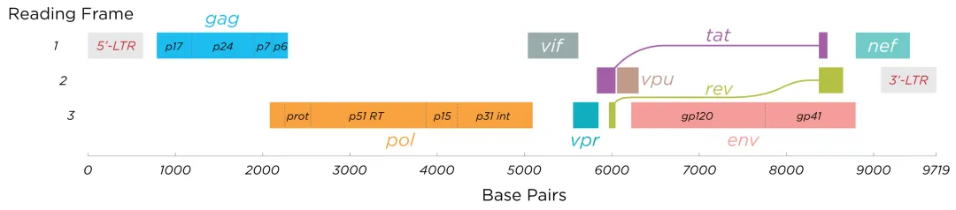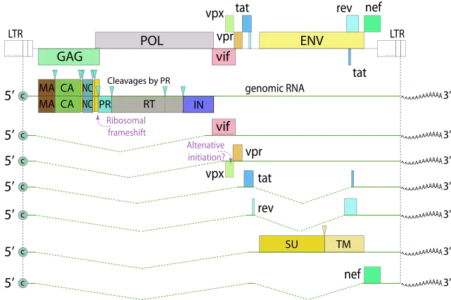 随着调控蛋白水平升高,尤其是达到Rev的阈值,转录过程开始向产生更长的未剪接和不完全剪接转录本转变,这些转录本编码结构蛋白和辅助蛋白,如Gag、Pol和Env。
