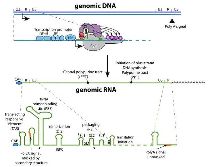 已知前病毒DNA两端均有LTR序列,每个LTR包含三个元件:U3、R和U5。病毒RNA的转录起始于5′ LTR的U3-R连接处,由于U3作为启动子,它位于起始位点的“上游”,因此5′ LTR中的U3序列不会被转录到RNA中。转录终止于3′ LTR的R-U5连接处,R元件包含poly-A信号,当聚合酶到达R元件末端时,它会添加poly-A尾并停止,留下3′ U5序列。在因此,病毒mRNA缺少5′ U3和3′ U5,从而形成两侧带有R元件的病毒RNA。