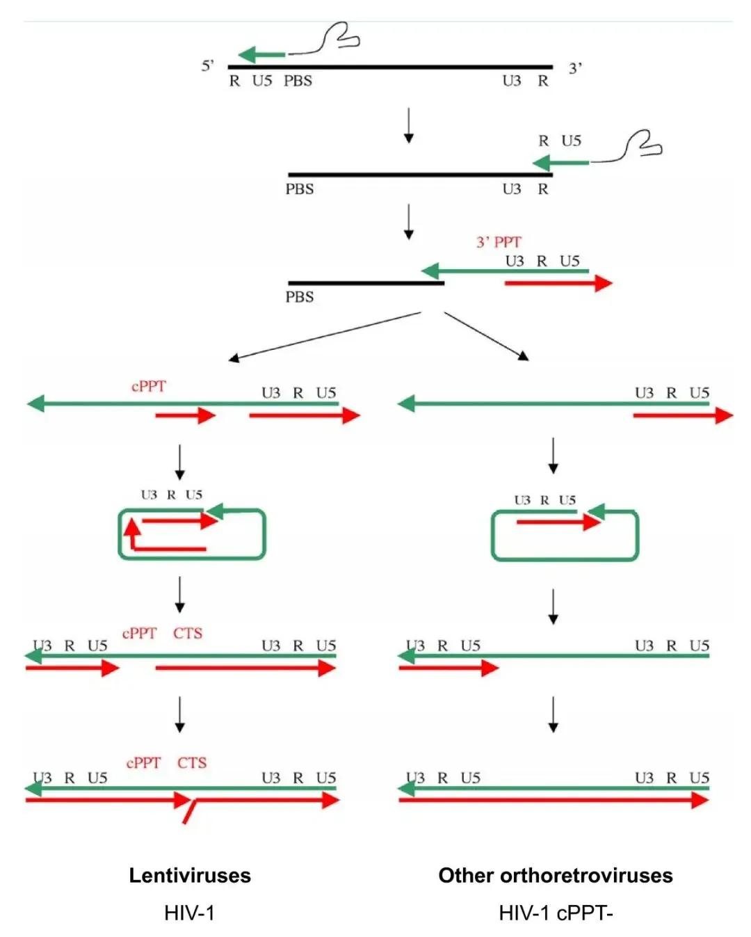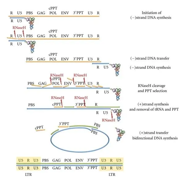 -DNA通过与基因组RNA 3' 端的R区互补杂交,从而‘跳跃’至相同或另一RNA的3' 末端,发生链转移,使得负链DNA继续延伸;-DNA合成过程中,RNase H功能在多个位点切割RNA-DNA杂交链中的RNA链,留下2个具有RNase H抗性的富嘌呤序列 (purine-rich sequence) cPPT和 3' PPT;