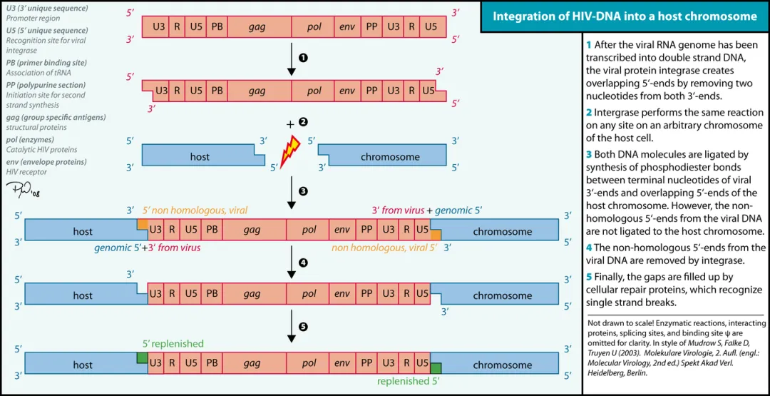 宿主细胞的DNA修复机制清除病毒突出的5' 核苷酸,并填补碱基对的制品,导致整合病毒周围宿主DNA序列的重复。