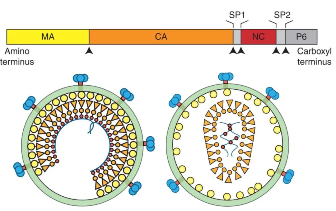 图14. HIV Gag蛋白与未成熟、成熟病毒颗粒结构示意图