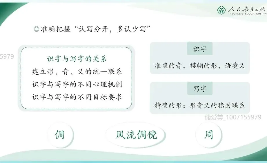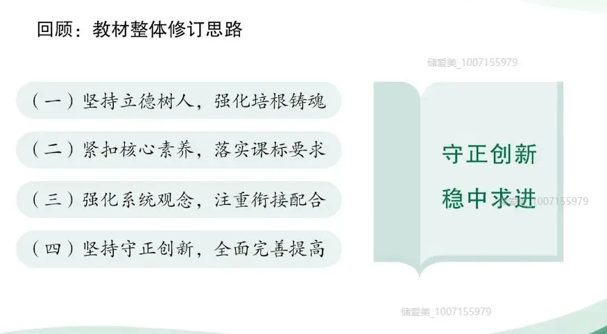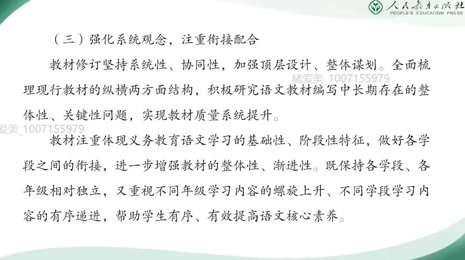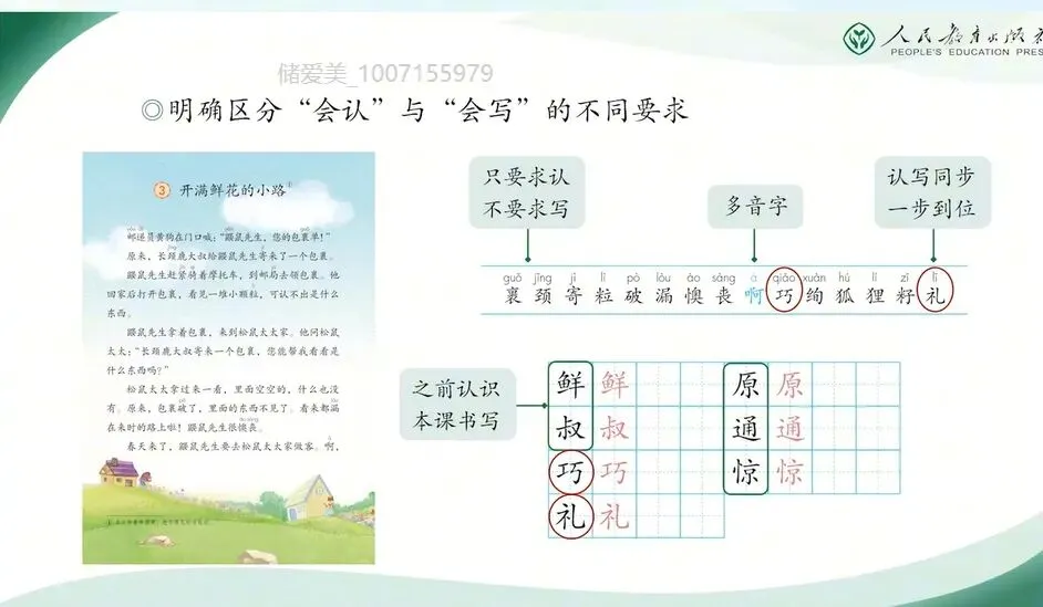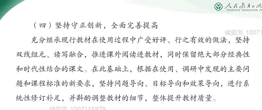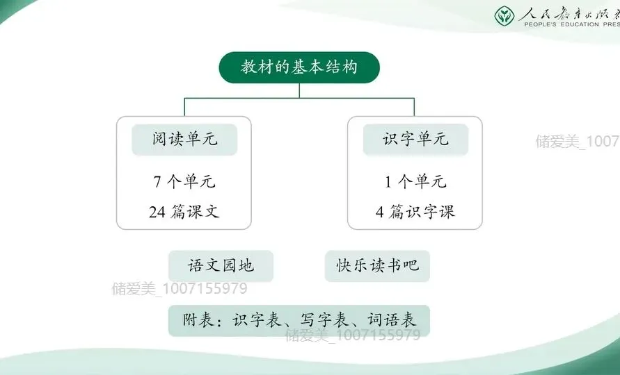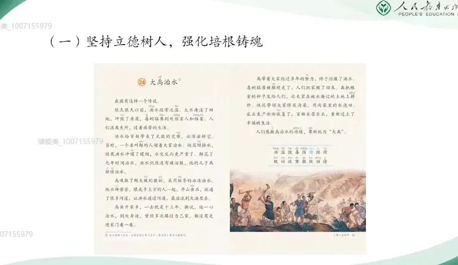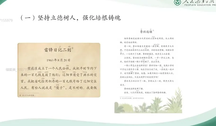 二年级下册体现了第一学段以及第二学段的平稳过渡,是学生知识积累和能力提升的关键阶段。今天的分享,我将结合教材编写意图和大家一起梳理本册教科书各板块的内容特点。并重点解析识字、写字、阅读、口语交际和写话等板块的教学要点。在具体介绍二年级下册之前,我们先来回顾去年在全国教材培训会上,编委会主任王立军教授谈到的这套教材整体的修订思路,他们是以下四点。(一)坚持立德树人,强化根本作用。坚持立德树人,强化培根铸魂,主要是认真领会贯彻习近平新时代中国特色社会主义思想和党的二十大精神。落实各类重大主题教育进教材工作,遵循国家课程改革的精神,全面体现课程标准要求。合理安排中华优秀传统文化、革命文化、社会主义先进文化相关内容,充分发挥语文教材育人的功能,为学生树立社会主义核心价值观,筑牢中华民族共同体意识、培养文化自信打好基础。 那么我们在二年级下册新增了《雷锋日记》《鲁班造锯》,还有《大禹治水》等经典故事,我们都能清晰的看到语文教材在立德树人方面的设计。比如《雷锋日记二则》,通过朴实的日记展现了雷锋同志一心向着党向着社会主义的忠诚信念和奉献精神。它不仅是革命文化进课堂的具体载体,更是引导学生在真实感人的事迹中理解为人民服务的深刻内涵,初步树立集体主义与爱国情怀。