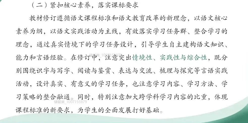 《鲁班造锯》以生动传说,呈现古代工匠,呈现古代工匠,勤于观察,勇于实践,不断创新品质,鲜活呈现了中华民族善于创造勤于实践的智慧。这篇文章不仅是对中华优秀传统文化中工匠精神的传承,更是潜移默化激发学生的好奇心和探究欲,培养他们劳动与创新的意识,树立文化自信。《 大禹治水》作为世代传颂的远古传说,歌颂了大禹公而忘私、尊重规律的科学治理精神,以及带领人民坚韧不拔、共建家园的团结奋斗的过程。它深刻体现了中华民族责任担当与治理智慧,有助于学生感受先民们与自然共存共荣的集体力量,理解中华民族共同体的深厚历史根基。这三篇文章通过具体可感动人的故事,将社会主义核心价值观、中华民族共同体意识、文化自信的种子自然而然地播撒在纯洁的心田上。(二)紧扣核心技能落实课标要求。教材修订遵循语文课程标准和语文教育改革的新理念,以语文核心素养为纲,以语文实践活动为主线,有效落实学习任务群,整合学习的理念。通过真实情境下的学习任务设计,引导学生自主建构语言知识能力和言语经验。在修订中注意突出情境性、实践性和综合性。即分别围绕识字与写字、阅读与鉴赏、表达与交流、梳理探究等言语实践活动,设计真实有意义的学习任务,也注意学习内容、学习方法、学习策略的整合融通。同时,特别注意加大跨学科学习内容的比重,体现课程标准新要求,为学生的全面发展打好基础。 比如新增的拓展活动,强调在真实情境中进行语言实践。第一单元找春天的拓展活动,将找春天的课文的言语学习,嵌入到真实自然的情境中。学生不再只是朗读文本中的春天,而是调用多重感官,自主建构对春天的个性化的认知,并在与同伴的交流中实现语言的实践。再如第五单元的拓展活动,这种设计打破了课文中心的局限,让阅读成为思考生活的工具。学生既锻炼了思维,又实现了语言的运用,这是整合学习内容、方法、策略理念的深度。再如对于读书角相关任务的修订,则引导学生基于真实的阅读体验进行交流,凸显阅读与表达的整合,强化学习任务的实践性。 通过这些调整,教材引导学生主动思考、主动表达、主动探究,并通过任务驱动的方式,实现跨学科经验的积累与文核心素养的整体,充分呼应了课程标准关于整合学习和综合实践的学习要求。教材修订坚持系统性、协同性,加强顶层设计,整体文化,全面梳理现行教材的纵横两个方面的结构,积极研究语文教材编写中长期存在的整体性、关键性问题,实现教材质量的提升。教材注重体现义务教育语文学习的基础性、阶段性特点,做好各个学段之间的衔接,进一步增强教材的整体性、建构性。既保持各学段、各年级相对独立,又重视不同年级学习内容的螺旋上升,不同学段学习内容的连续性,帮助学生有序有效的提高语文核心素养。比如基于系统性原则,二年级下册在篇目上进行了优化调整。 第二单元增补了《我不是最弱小的》,深化关爱助人的单元主题内涵。将原属于第二单元的《一匹出色的马》调至第四单元,更好的契合充满童真的想象这个主题。将原有的《大禹治水》篇目进一步改写完善,与《羿射九日》《黄帝的传说》共同构成远古传说单元。内部聚合的更加紧密,单元之间的逻辑更加清晰。此外,我们将快乐读书吧移至第二单元的后面,此项调整基于两点考虑。第二单元以儿童故事为主体,快乐读书吧文体更加契合。第二引导教师认识到,随着不同言级文体单元风格的变化,快乐读书吧的位置也将有相应的调整,实现与中高年级之间的有序连接。当然,也鼓励各位老师结合班级学情与校本读书活动,可以在决机之初就安排我们整个学期的读书计划。除了篇目调整之外,课后题、语文园地等板块的优化同样是本次修订的重点。后面我向各位老师做详细的阐述。(四)坚持守正创新,全面完善提高。充分继承现行教材在使用过程中受到广泛好评,行之有效的做法,坚持双线组元、读解融合,推进课外阅读进教材,同时保留绝大部分经典性与时代性结合的课文。在此基础上,根据在使用、调研中发现的主要问题和课程标准的新要求,坚持问题导向、目标导向和效果导向,进行系统性的修订不足,并斟酌教材的细节,争取提升教材质量。综上所述,本次修订的核心思路可以归结为以下四点:第一就是要落实中央育人的精神,强化价值的引领;第二个就是要对标课程新标准,聚焦核心素养;第三就是注重教材的系统性,体现纵横衔接;第四就是整体继承,精准修订。因此,新版教材并非对原有体系的颠覆,而是在保持结构稳定,特色延续的前提下,进一步的优化细化内容,使其更便于教学,利于学习,更好的服务于师生的课堂实践与素养发展。本次教科书从结构体系上与二年级上册基本相同,围绕特定的人文主题组织阅读单元。阅读单元虽然没有像中高年级一样明示语文要素,但每个单元都有相应的教学重点。这些教学重点在我们的教师教学用书中都有明确的教学指导。我们再介绍后面的阅读板块内容时,也会根据单元的顺序来重点介绍。我们全册有24篇课文,组成7个阅读单元。由四篇识字课组成一个识字单元。每个单元一般有3~4篇课文,包括思考练习题,还有一个语文园地组成。快乐读书吧编排在第二单元后面,语文园地的栏目同二年级上册是一致的。教科书有三个附表,识字表、写字表