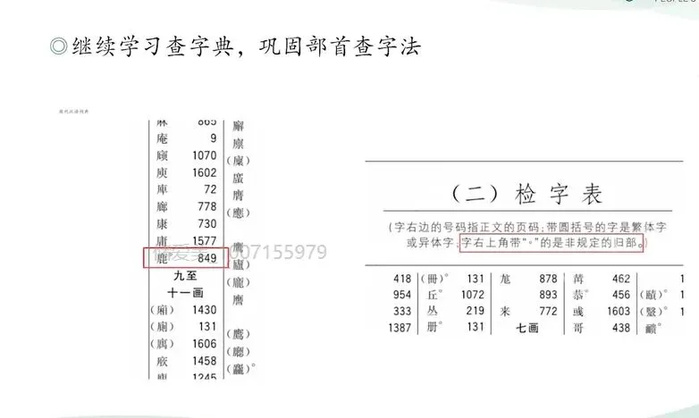 在实际的教学中,老师和同学可能会遇到这样的一个问题。比如我们来查这个“鹿”字,它规范的部首应该是它本身。那么有的字典或者词典,可能在广字头下面也能够查到这个“鹿”字。但是我们会发现这个路的右上角有个小圆圈,说明这个字并不是能够放在广字头下面。这个我们在检测表的下面有一个小字,它就说了,如果右上角带有小圆圈,说明这是非规定的归部。那么这个是我们的字典编撰者为了方便我们读者查找,除了在它这个字的原本部首的归部以外。在我们传统习惯中认为的归部里面加入了这个词,并非说这个字有多个部首。一般一个字只有一个部首,这是我们老师们要需要向同学们说明的。那么需要注意的是,我们不同字典处理方式可能不胫相同。比如说我们在现代汉语词典里面可能可以在广字头里面查到这个“鹿”字,但是在新华字典都查不到。因此指导学生掌握规范的部首知识,对其形成系统的稳定的查字能力是具有重要意义的。那我们在教学中,老师就可以结合这道题目中的事例,当然也可以补充生活中常见的汉字,引导学生去实践查字典验证的这样的一个活动,如这个字“膏”那我们学生看到这个字,就知道我应该查上面的高字它的部首,而不是点横头。比如说毕竟的“竟”字,那我们看到的时候,你就知道我们应该去查音,而不是查立。通过这样的持续的训练,既能帮助学生建立规范的查字典的习惯,也能进一步提升他们自主识字的能力。