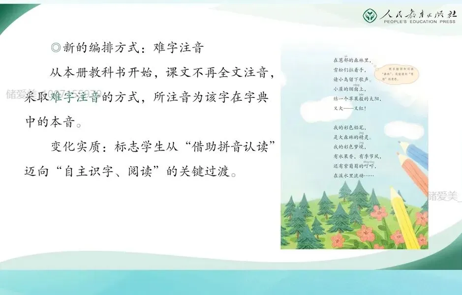 二年级下册与前几册相比,编排形式上最大的变化就是课文由全文注音改变为难字注音。从本册开始,课文采取难字注音的方式,所注的音为该字在字典中的本音。这转变体现了对学生识字能力发展的阶段性要求,标志着学生的汉语学习从“借助拼音认读”迈向“自主识字、”阅读的关键过渡。