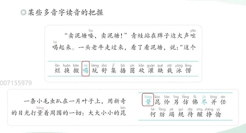 需要特别说明的是以上提到的个别读音把握课程标准和我们的教材均定位为在教师指导下正确的朗读。那我们的教学评价,也应该以学生是否在指导下正确流利的朗读课文为依据,不宜将其作为知识性的内容进行独立的测试,建议老师在朗读中适时的点播引导,帮学生形成自然规范的朗读。