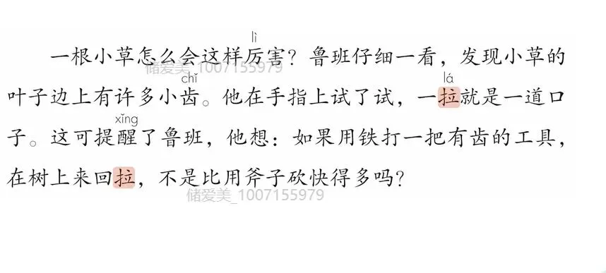 还有我们的《鲁班造锯),鲁班造句里面正好有个多音字“拉”。“他在手指上试了试,一拉就是一道口”,这个“拉”就是割破的意思,那么到后面,有一句“如果用铁打一把有齿的工具,在树上来回拉”,这里的特别要注意还是读第一声。