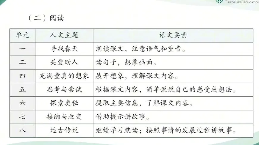 接下来我们进入了第二个板块,阅读板块。那么本册教科书课文内涵丰富、语言典范、难易适中。既确保教科书实现育人价值,又保证可读性和感染力,便于学生学习和积累语言,使学生在思想上获得启迪,在情感上受到熏陶。我们七个阅读单元围绕着寻找春天、关爱助人、充满童真的想象、思考与尝试、探索奥秘、接纳与改变、远古传说的人文主题编排。各个阅读单元安排的语文要素包括朗读课文,注意语气和重音;读句子想象画面;展开想象,理解课文内容;根据课文内容,简单说说自己的感受或想法;提取主要信息,了解课文内容;这是提示语讲故事;继续学习默读,按照事情发展的过程。讲故事。在整体把握教材修订思路与篇目调整情况的基础上,我们可以看出,二年级下册的阅读单元,在主体内容和结构框架上,与老师熟悉的原有教材保持了稳定的衔接。为了便于各位老师系统的把握教学重,接下来我将以单元为序,聚焦于每个单元在人文主题、语文要素上的编排课程,有针对性的提示各个单元在教学实施中值得关注的问题与建议。