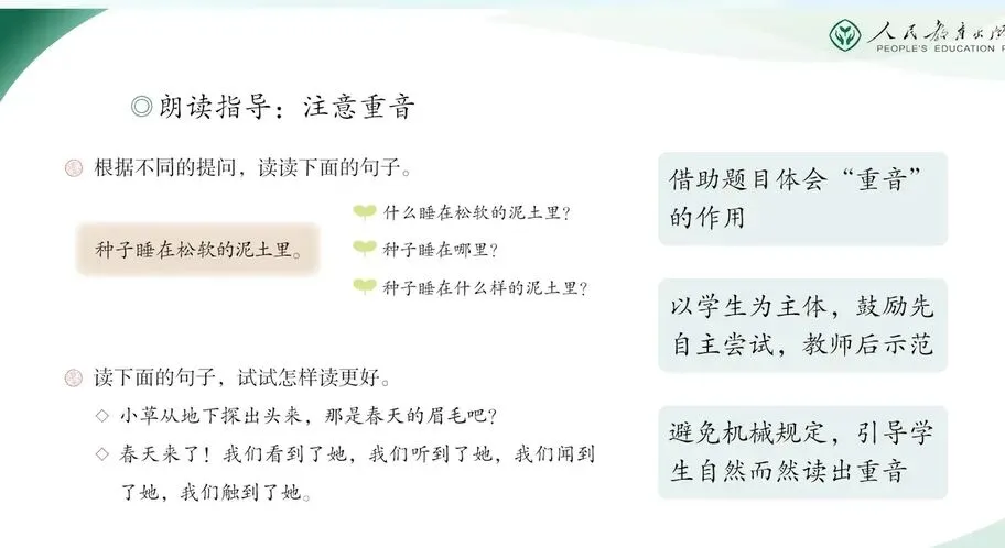 注意重音则是在二年级上册《数星星的孩子》一课中初步感知的基础上,我们在本单元进行更明确的指导。教学中可以借助语文园地中“根据不同的提问,读下面的句子”这一练习题引导学生在问答情境中尝试确定重音,体会其功能。那么在课文的朗读指导中建议你。学生为主体,鼓励他们先有自己的理解,尝试进行朗读。教师不要急于示范,而是给予学生充分的体会与探索空间。