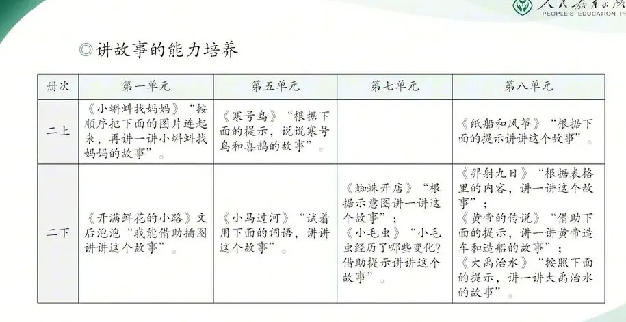 讲故事的能力的培养贯穿了整个第一学段,是低年级阅读与表达的核心问题。二年级上下册都安排了多次的讲故事的练习,它不仅能够激发学生的表达兴趣促进对文本内容的理解和内化,也为三年级开始复述故事打下坚实的基础。虽然教材在第七、第八单元才将讲故事作为明确的语言要素体现,但相关的能力的铺垫,从第一单元就在有意识地进行。本册第一单元的重点就是借助单幅插图的故事,这是在二年级上册借助多幅图讲故事。比如说我们的《小蝌蚪找妈妈》的基础上有一个进一步的提升。单幅图信息集中线索更隐含,对学生的观察力、组织语言能力提出更高的要求,因此教师引导更为关键。以《开满鲜花的小路》为例,文本中的角色比较多,故事线索也相对比较复杂,那么教师就可以充分的利用文本插图,帮助学生梳理角色的关系,理解鼹鼠先生从家到松鼠太太家的路线,从而有序完整地讲故事。