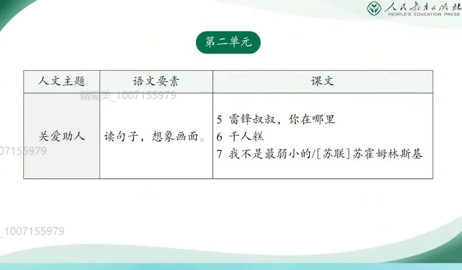 第二单元围绕着“关爱助人”这一人文主题展开,对应的语文要素为“读句子想象画面。引导学生想象画面”,是培养其阅读理解与情感体验能力的重要途径。从二年级上册展开想象,获得初步的情感体验到本单元聚焦于读句子想象画面,体现了从整体感知到局部具象,从情感共鸣到形象建构的能力发展过程。这样的安排,有助于进一步提升学生的想象能力和阅读理解。那么本单元在篇目上进行了优化,新增了《我不是最弱小》的一文,关爱助人的主题的更加的契合,更加的紧密。