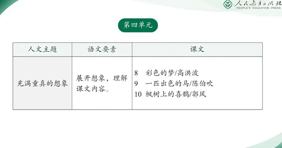 第四单元围绕“充满童真的想象”对人文主题展开,对应的语文要素为“展开想象,理解课文的内容”,引导学生展开想象,不仅是理解文本的重要手段,也是激发阅读兴趣,培养创造性思维、丰富情感体验的关键途径。在小学低年级阶段,依托课文情境展开想象,能够帮助学生在语言与形象之间建立联系,从而更深入地走进文本,体会文字背后的情感与意义。本单元的三篇课文在想象训练的侧重点上各有特色。教学中应结合文本的特点与课后习题设计有针对性的学习活动。《彩色的梦》以诗歌的形式呈现一个由彩色铅笔勾勒的梦幻世界。教学时可以引导学生调动多种感官,在朗读中构建画面,并鼓励他们结合自身的经验,口头或书面中补充我的彩色的梦,在联想与表达中丰富生命。《一匹出色的马》通过父亲巧用柳条激励妹妹的故事,展现了童趣与亲情。教学中我们可以借助角色带入的方式,引导学生体会妹妹从求抱到骑马的情绪变化,并链接生活,分享自己在生活中把普通事物进行想象的游戏。这样的经历的回忆,能够促进学生的情感共鸣和表达。《枫树上的喜鹊》以儿童视角将喜鹊的叫声想象成对话。教师可以围绕鹊鹊鹊等叫声,引导学生进行言语转换练习,尝试将其译为具体的语句,并鼓励他们创编简单的喜鹊小故事,在趣味的转换中理解我的想象世界。总之,本单元的教学应该紧扣“想象”这一主线,让学生在读想说写的语文实践中逐步的提升形象思维能力与语言运用能力,真正的实现在想象中理解,在理解中丰富想象的教学目标。