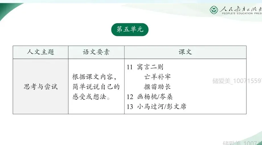 第五单元围绕“思考与尝试”这个人文主题展开,语文要素为“根据课文内容,简单说说自己的感受和想法”。这是在二年级上册对感兴趣的内容说出感受的基础上的进一步发展,强调学生的感受应建立在对文本内容的理解上,并用日常口语表达自己想法中最重要的部分。