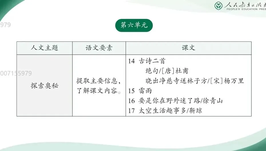第六单元以“探索奥秘”为人文主题,语文要素为“提取主要信息,了解课文内容”。这一要素是在一年级寻找明显信息,做出简单判断的基础上的进一步延伸,只在引导学生从文本中筛选出与理解内容密切相关的关键信息,逐步培养其整体感知、归纳梳理的阅读能力。