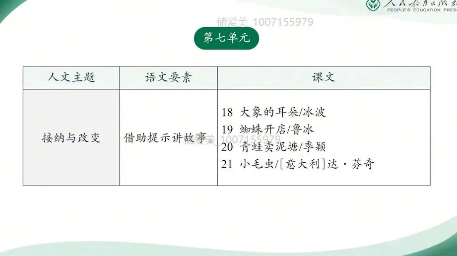 第七单元围绕“接纳与改变”这一人文主题展开,语文要素为借助提示语故事。本单元引导学生借助关键语句、示意图和插图等提示,梳理故事内容以及进行训练。既是第一学段学生把握内容组织语言的重要方法,也是发展逻辑思维与口头表达能力的有效途径,为三年级系统开展复述的训练奠定基础。教学时,教师应引导学生先走进故事本身,在朗读中理解内容,在梳理中把握情节,在品读中感受形象,进而结合生活经验,自然体会故事中蕴含的朴素的道理,要特别注意避免脱离文本空谈道理,或者对寓意进行过度的挖掘或拔高。