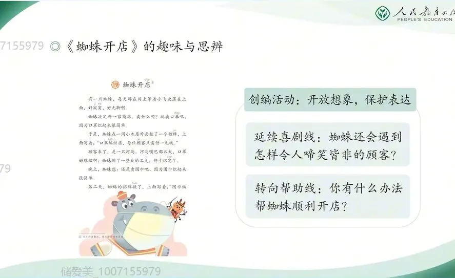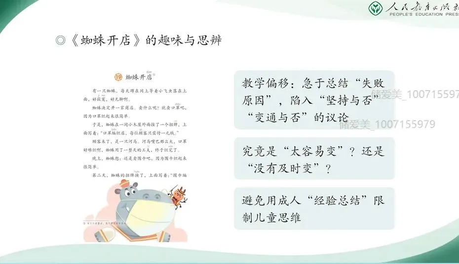我以《蜘蛛开店》为例,我们在教学中容易出现一种倾向,就是急于去帮助学生总结教训,分析蜘蛛开店失败的原因。在具体的听课调研过程中,有的老师归咎于蜘蛛他不断的改行,缺乏坚持,没有坚持不懈。有的老师则认为他不懂得及时变通,定价很僵化。那么蜘蛛究竟是太容易变,还是没有及时改变呢?那么这种这样的解读虽然具有一定的思辨性,却容易将教学的重心从感受故事的趣味,迁移到总结开店经验这样一个路程。不仅可能削弱了文本幽默色彩,也限制了学生接下来故事创新的思路。比如说老师们如果给学生定调说蜘蛛没有坚持不懈,那么学生接下来的创编思维就是蜘蛛如何坚持不懈。如果老师给学生定调说,因为他不懂得变通,这个定价太僵化。那么接下来学生创编的时候就只有一种思维,那就是蜘蛛如何定价,所以我们用成人的这种经验总结,可能就限制了儿童的对于故事的感受和他的创编思维。