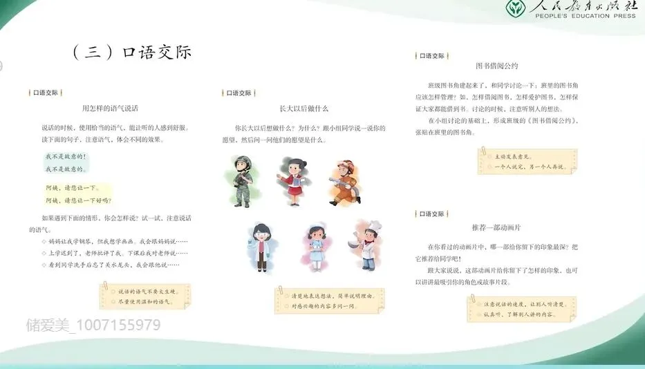 第三个板块是口语交际。那么本教材共安排了四次口语交际,分别是用怎样的语气说话,长大以后做什么,图书借阅公约和推荐一部动画片。这四次交际活动设计精当,循序渐进,共同构成了一个培养学生基础口语交际能力的有机整体。