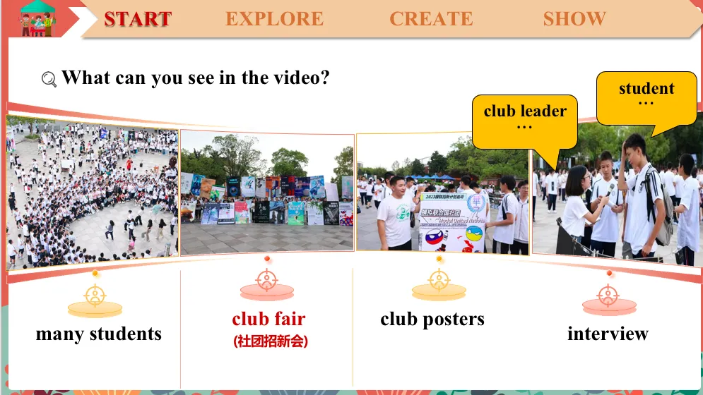 So what can you see?I can see many people. OK, many people. So who are they?Excellent. They are students, right? Very good. And what are they doing? OK, this girl, please. Yes, they're trying to join clubs, right? And we call this activity…?A club fair. So a club fair is an event where club leaders can find members for their club. OK. So read after me, club fair, club fair. And what else can you see?OK, this girl, please. All right. Many different posters, right? So why are they putting up posters?OK, that girl. OK. Very good. They want to find members, right? OK, who wants to find members?OK, you see, if I am the founder of the club, I want of find the members, right? So I am the club member or leader?Leader, right? So in what way else can I find members besides putting up posters?OK, look at that picture, what are they doing?They seem to be talking, right? It seems that the club leader is trying to ask the student some questions. So we can call this way an…?An interview, right?