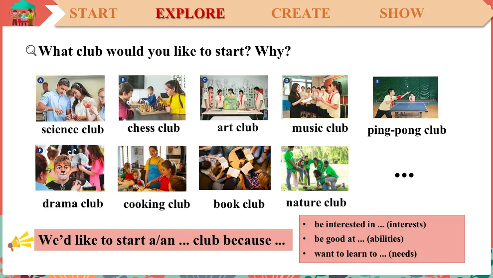 So now that we know what to do. Let’s start with step one.So what club would you like to start and why?Let's see what clubs we've learned. So what is this club?Science club. And? Chess club. And? Art club. And so many more from our textbook, right? So you can choose from them or you can create your own. And you need to tell me the reason according to your interests, abilities and needs. (选定社团名称并解释理由)