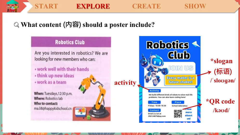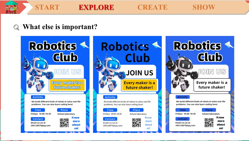 OK, you see.So what content can we get from this poster?First, can you tell me what this club is?Robotics club. Oh, you mean robotics club, right? OK.So how can you know it's a robotics club? Can you tell me how you find it?OK. That boy. Yes, you please. Because I can see a picture about robots. OK, you mean right here, right? It is a picture about a robot, right? OK, very good. So picture. How else do you know its a robotics club? Is there another way to know?OK, you, please. You again? You are very active. All right. The title. Right? So it means that for a club, the title and the picture are the most eye-catching information, right? So what other information can you get from the poster?Have a look. Think about it. What other information? OK. You, please. I think place. OK, you mean where means the place, right? And can you go on? How about when?That is the time. And any other information? How about right here? Who to contact, do you know the meaning of contact?Actually, contact means someone you can call or email for more information. So do you know the meaning of it? What does that mean? Right. OK, read after me, contact, contact. OK. So we also need contact, right? And how about this part?So what is this information about? OK, let me give you a hint. So pay attention here “who can do these”. These are the…?Yes, the ability of the members, right? And how about the sentence at the beginning? What are these for? You see, at the beginning, we can use it to….? Ask questions, right? Or we can say introduce, right? Introduce. So we can call this information a lead- in. So look at that. But is that all? Can we make the poster better?OK. Look! I made one myself. What do you think of it? Do you think its a good poster? So what other information can I add to it? OK, that boy. I think… Oh, yes, you have a sharp eyes. So activity, right? We can add activity. OK, very good. And any other information? How about right here? It is called the QR code. And how about this sentence? Let's read it a little. Every maker…, go. So what does that mean? Every what maker? Every maker may shake the world. What does that mean, shake? Right. It means change. So what does this sentence mean? OK, that that girl at the back. Yes, you please. Very good. Excellent! So we call this kind of sentence…? A slogan.So why do you think I add a slogan?Why do I do that? OK, you, please. Because I think it can catch students’ attention. OK. Catch students attention, right? OK, very good.