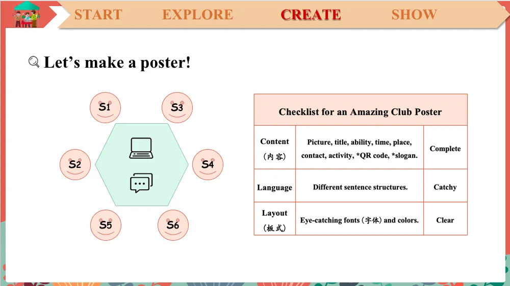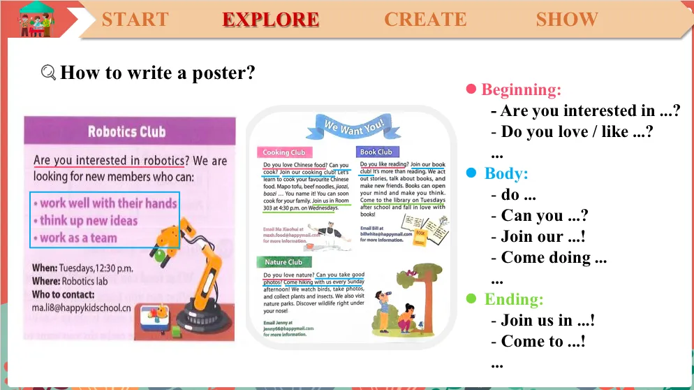 So now let's try to summarize.To make an amazing poster, we need information or content like the…what?The name of the club, right? That is the title, right?What other information?Yes, maybe the ability, right? Members' ability. And any other, do you remember?OK, activity, right? And anything else?Hey, don't forget the picture. That is very important. And anything else?Where do I go? When is… Yes, the time and who to contact? And we can add …?We can use some sentence structures like, can you do to describe the ability or come or doing something to describe the activity?And last, but not least, if you want, you can add a…?Slogan to make your poster more attractive and inviting, right? OK. Very good. (学生自主分析海报样本,提炼评价标准)