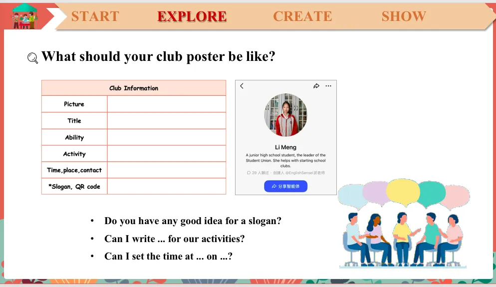Now it's your time to discuss in your group and figure out the club information for your club. But don't forget to discuss with each other first and you can use these questions to guide you. And if you are still not sure about how to say something, you can ask me or Li Meng for brilliant ideas. Yes. So do you know what to do? Yes. OK. Go. If you finish discussion, you can send it to your QQ group.