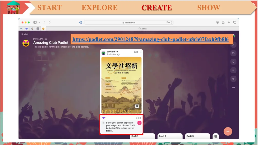 And let's enjoy each other's poster and leave some comments. OK? Upload. And for the teachers, you can also scan this QR code and check out the students’ posters. And you are more than welcome to leave some comments too. OK, and everyone please enjoy each other's posters and leave some comments. Leave some comments, please. If you like it, you can give it a big heart, OK? And if you think it can be better, you can also leave some suggestions. Don't forget to leave some comments. Your comments are very valuable for us to make our posters better.