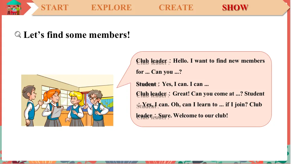 And for the ending part, what sentence can we use?Join us in or you can use that sentence to welcome the members. What’s that? Come to. OK.