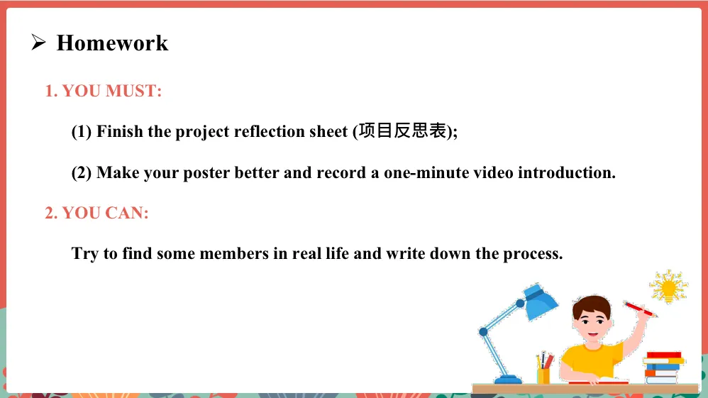 First you must finish the project reflection and make your poster better according to the advice and add one minute video introduction to the QR code and send it to Li Meng. Also, you can try to find some members in real life and write down the process. So do you know what to do? Yes.