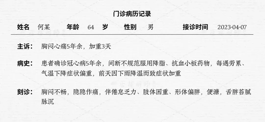 · 病史:确诊冠心病5年,间断不规范服用降脂、抗血小板药物。每遇劳累、气温下降时症状加重。3天前因下雨降温,症状再次加重。