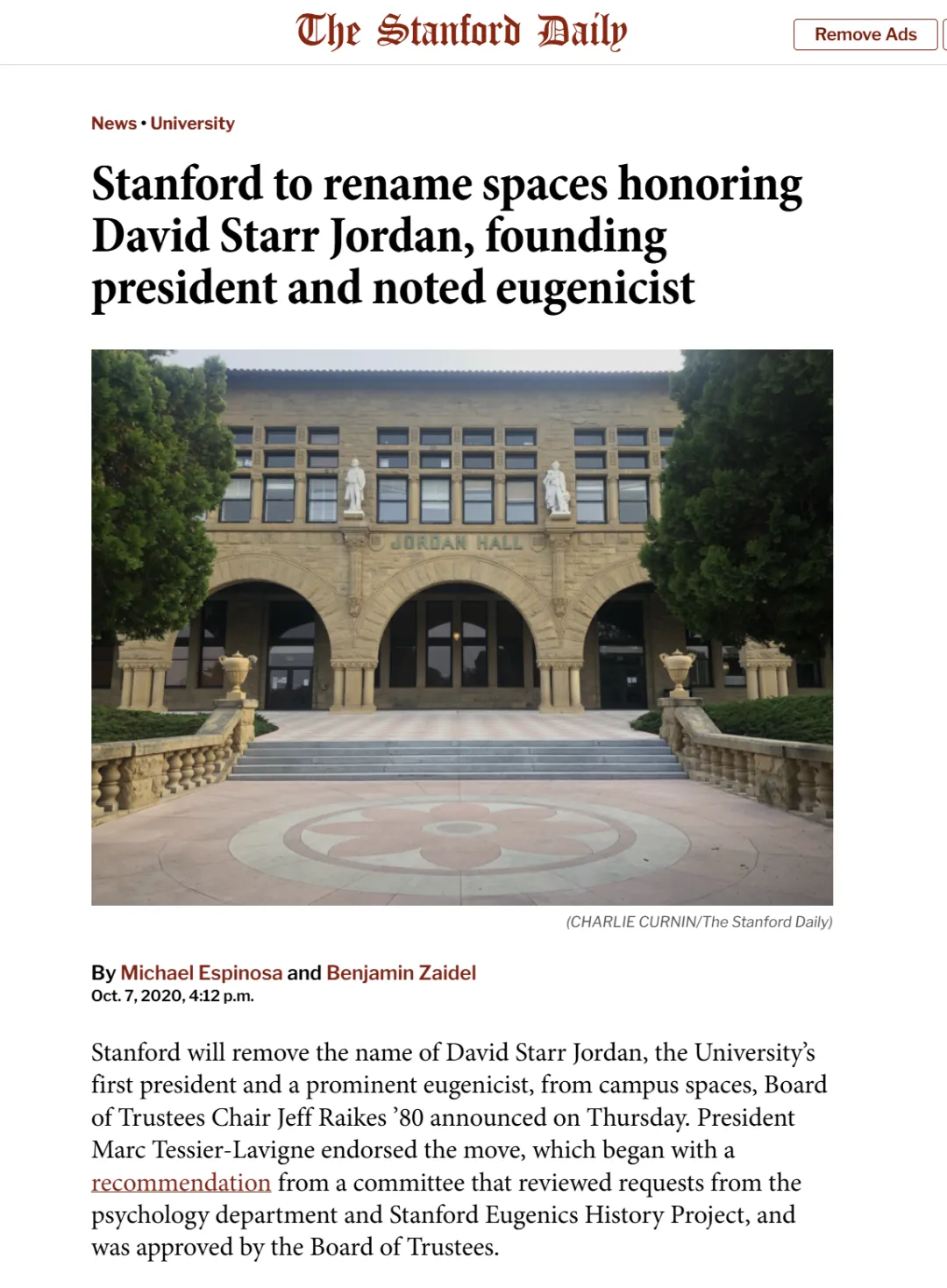 我查到这本书出版六个月后,斯坦福大学迫于舆论压力,将校内以大卫·斯塔尔·乔丹命名的大楼更名了。