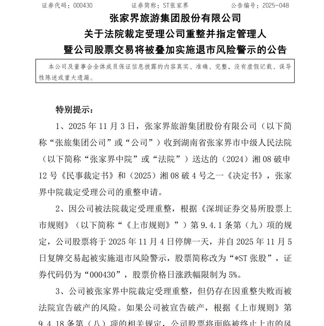 2024年公司开始预重整,2025年11月3日公司得到张家界中院的受理重整申请,4号停牌,5号股票大涨,股价涨到8.77元,这个利好消息很重要。