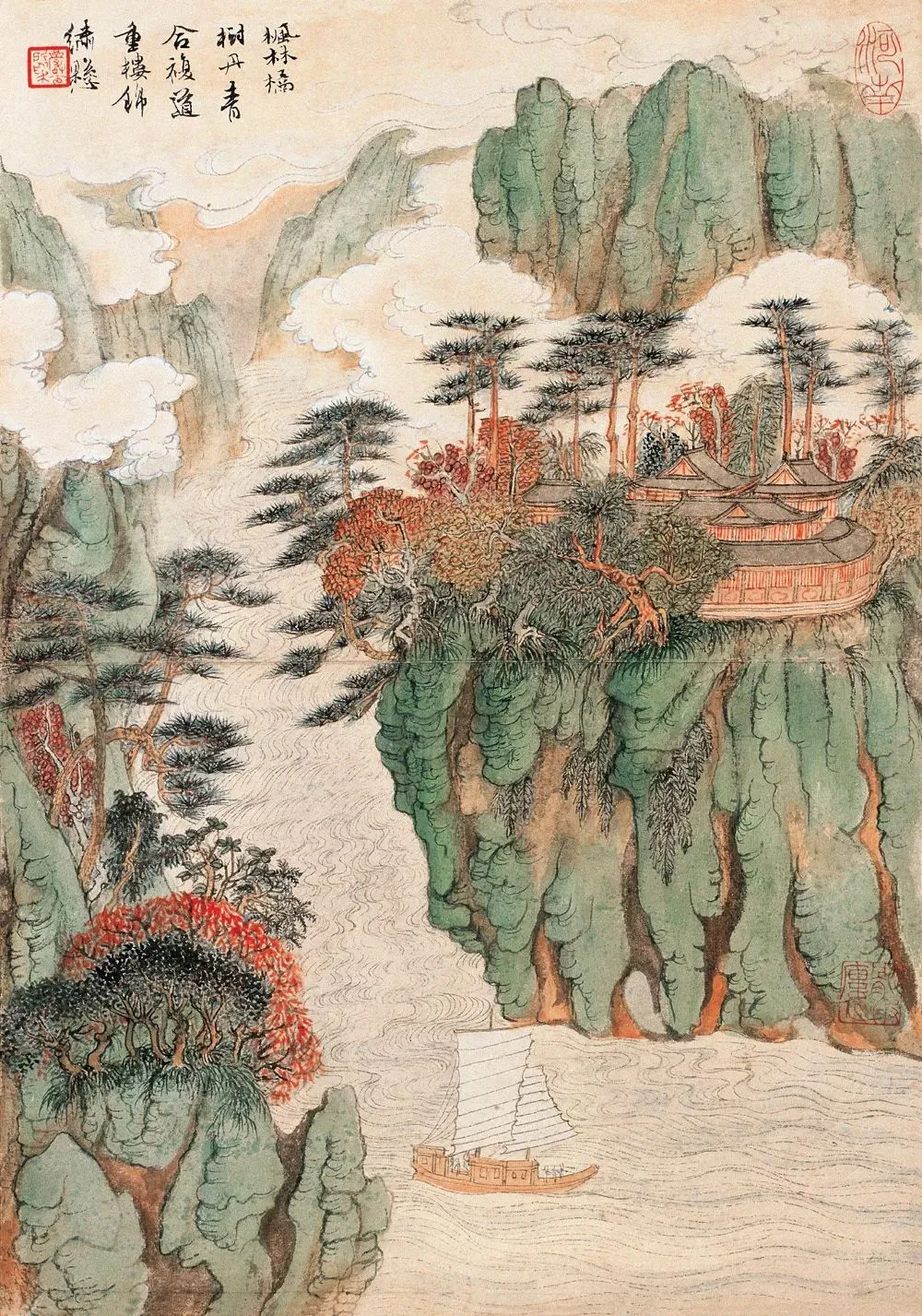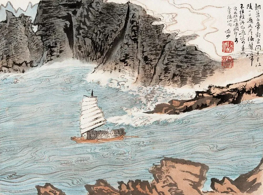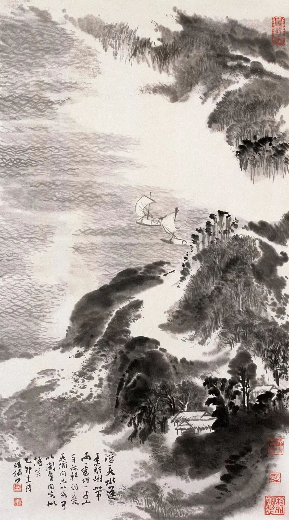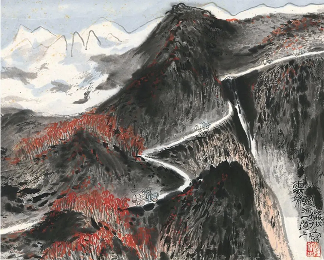 陆俨少是海上画派的重要代表人物,他的笔墨层次丰富,气韵生动,线条变化流动,意境卓绝。他曾说:画云水,用笔要流畅飞动,和山石在笔墨上形成尖锐的对比,使动者益动,静者益静。独特的云水法、留白法, 多变的章法取势, 将诗、书、画放于并重的地位, 并能很好地将其融合在一起。他在深入师法传统的基础上通过大量的写生与体验生活, 在自然的观察学习中敢于创立新法, 给传统山水画带来新的笔墨语言, 但并非拘泥于某一家某一派, 也并没有传统文人画家那种崇南抑北的思想, 继而确立了其山水画独特的艺术面目, 形成了极具个性的“陆家山水”。他的山水画的独特之处在于笔墨形式多样, 用笔丰富,突出表现在以下三个方面:一是他善于将云水、江河、湖海的汹涌澎湃、浩渺弥漫之势描绘得淋漓尽致,特别是表现云和水的动感最为精彩,不仅笔墨淋漓顿拙,而且气韵生动、神采飞动。可以说,陆俨少是自古以来擅画云和水的第一高手。二是构图独特。众所周知,一般画家构图总是从大到小,陆俨少的构图恰恰相反,别具一格。三是陆俨少无论大画还是小画,依仗着一支笔,点点滴滴、条条块块、黑黑白白、干干湿湿、浓浓淡淡,创造出独具风格的“陆氏云水”。同时他的一支笔画到底,在画界堪称一绝。他早年的山水注重于点线条理结构,有明洁、空灵、秀逸的韵致,所作多以细密且较干的点线交织以表现疏落的秋景,从中可见传统浅绛法的影子。中年时期陆俨少的山水注重于写生,汲取造化的浑然之气和光影感觉。郁茂的丛点表现在其山水画中起了主导性作用,团块结构成为画面的重点,且以虚灵笔墨和留白作为穿插映带,这使得他的山水画由早年的结构条理明晰,向着中年的峻厚浑然发展。后来他画山水着意于笔墨的铺陈性,注重于连续成片的运笔,这使其运笔速度因而略略加快,笔端很自然地流露出笔姿风情,其中亦略有粗服乱头的荒率。运笔速度的略略加快,既出于面对写生的情绪感染,还因为画中多用浓重郁密的湿墨,而笔头蘸上饱和的水墨下笔须快,慢则墨水会渗开,不见点画。当然这由运笔速度略略加快而引发的笔姿风情,是由陆俨少深厚的工写功底所引发,是一种天机自然流露的潇洒,而绝非草率。由于更为强调大黑大白的阴阳关系,与干湿浓淡轻重的对比,这使陆俨少的山水画更见苍厚灵动,生机勃显。笔迹铺陈茂密,笔姿潇洒而灵动,笔墨层层映带,且又兼有留空之穿插呼应,这些特点,构成了陆俨少中年时期山水画精品的特有风韵。从中年时期的创作可见,陆俨少状物写象的兴趣相当广泛,不但山水、人物、花鸟皆有涉猎,梯田、公路、水车、汽车、轮船乃至飞机,竟在他的山水画中都有所表现。陆俨少早年欣赏“士气作家俱备”的项圣谟,其实他自己的绘画天性亦是“士气作家俱备”。陆俨少早期偏于写意的纯粹笔性修练,中年时期则致力于画意的丰富拓展,兼顾笔性与墨法的发挥。写意的士气,决定一位国画家精神修练的深度;而画意的作家气,则是一位画家面对形象的敏感反应,这亦是画家不断拓展创造力的必要条件。在创作中,他非常善于借助山、云、水之间的曲线穿插来突出动势,将笔下的山脉以斜势置于画面中,一座座高山有如在水面上扬帆而行,云水连接成带状曲绕山峦间,形成云随水动,水随云流的效果,整个画面如旋如舞,是表现画面动势的最佳写照。对于山、云、水的造型处理,他偏向于通过笔迹的虚实变化来作近于抽象性的表现,而这种对于笔迹的掌控更利于突出画面的起伏节奏。他说:“重实处一般用焦墨浓墨,用笔必须坚实沉着,繁重密致,使得有厚的感觉。”因此他的画可以说是通过笔与笔之间产生的合力,共同构筑画面的动感。同时他的画面中墨色多变,其浓淡干湿的对比既增加了画面的韵味,又丰富了画面的层次。在山水画中以笔墨构成本身的虚实对比来突出画面主题,他要显示笔触本身的形迹,因此,留白几乎是散步于整个画面各种笔迹的间隙——因为倘若笔迹的周遭全无留白,笔迹没有底下的留白来映衬,笔墨本身的形迹也就难以明显地存在。因此,陆俨少的山水画,似可说是以白为体,以黑为用。这白指纸,黑指有笔墨处。黑既承载于白之体,而以黑来调动白。如他发现画面气太散,就用笔墨来将气团紧,如发现气太紧,又用笔墨来疏导之,这就是以黑来调动白。