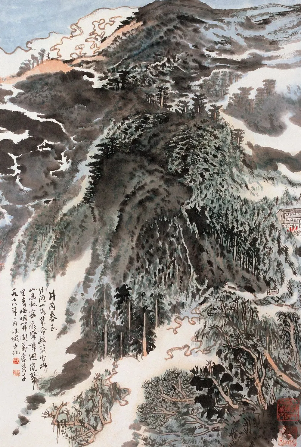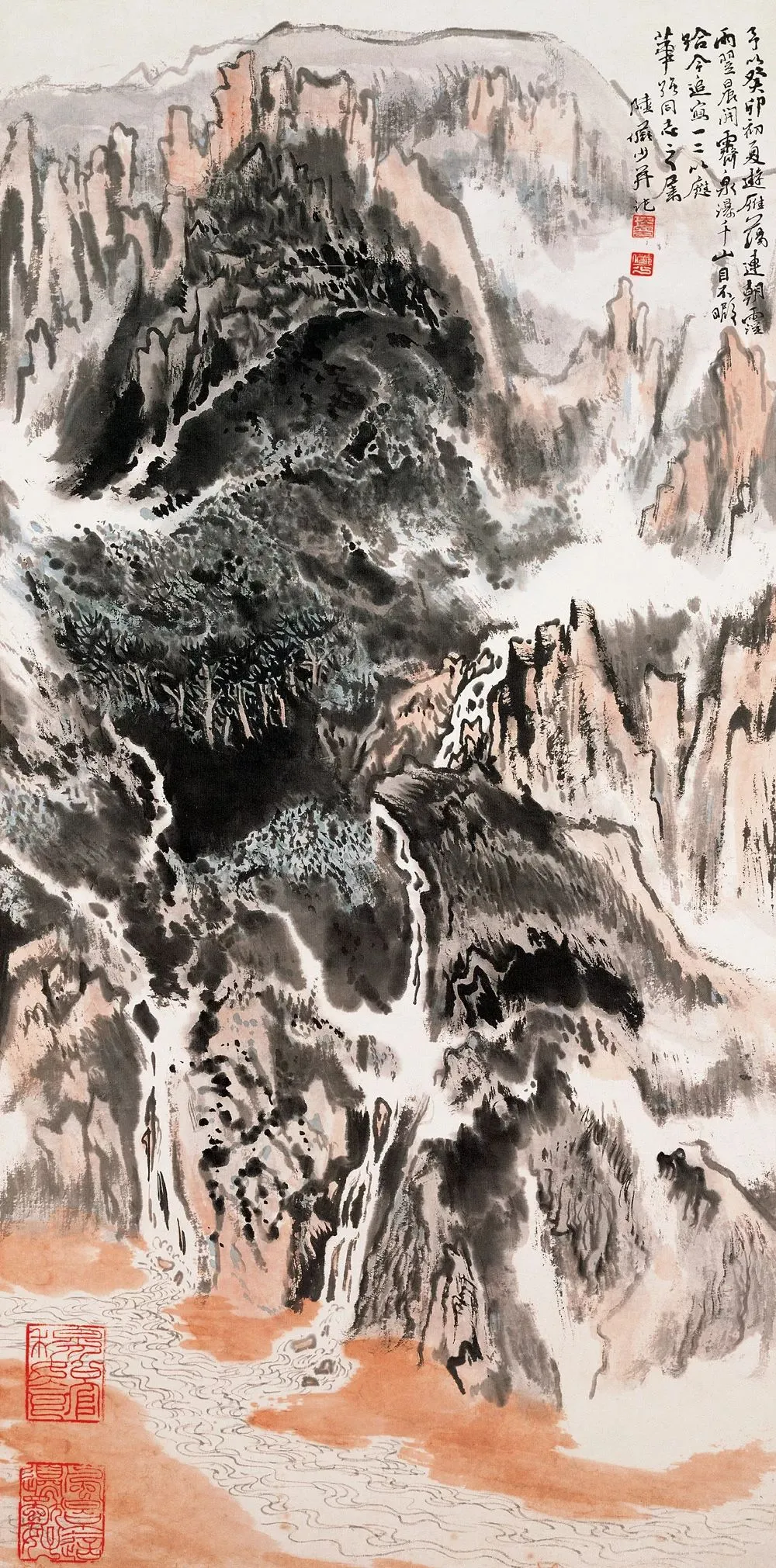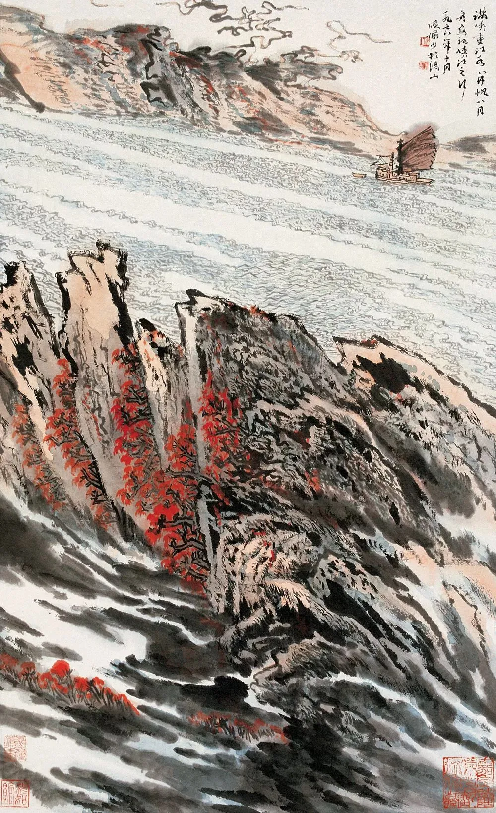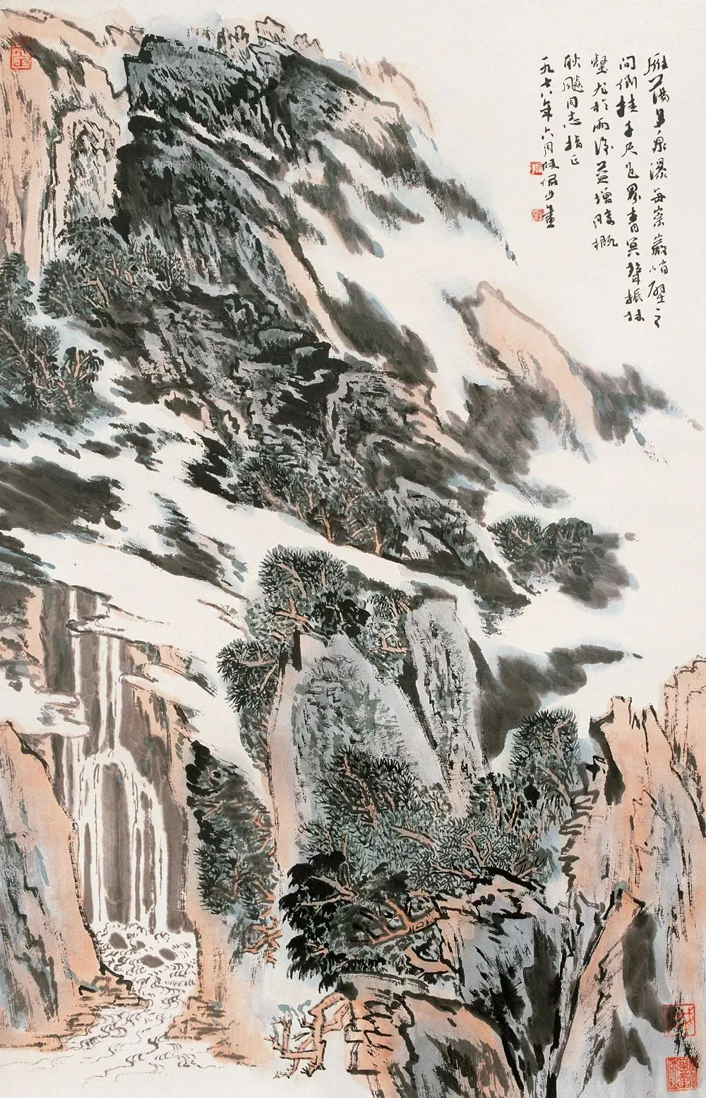 “自由”及“多变”是以表现技法与表现程式的多样性、丰富性为基础的。他山水画的特点还在于形态体制的多样性,内容的极度丰富性。他于各种传统技法兼收并用,无所不擅,不为一派一家所拘,故作起画来,连贯一气,驰骋有余。他是文人画家,师法董源、巨然、“元四家”及董其昌等。如他画水就广泛研习古代画水方法,加以变通,得以随心所欲地画出水的千姿百态。他画树初从“四王”入手,后学习元人,最后以北宋诸大家为宗。画山石从董源、巨然、“元四家”及董其昌入手,以披麻皴为主,又喜王蒙细牛毛皴,求笔墨意趣。他不鄙北派山水画,大胆借用李唐等刚劲利索、大刀阔斧的皴法于画中。他使用的皴法极多,并能将各家各派技法巧妙结合。他在回归笔墨根本的同时他又克服了山水画发展到明清时期积存的诸多弊病, 解决了山峦结构脉络及空间层次表现等许多问题, 然后再把笔墨内涵的开掘作为重心, 创造出许多全新的表现手法。他的艺术语汇勾、染、皴法, 对于云水的独特勾勒表现方法, 对于山石的皴法, 都是自出机杼, 独成一家, 这样笔墨就具有扎实的形体依附, 形体又具有生动的笔墨充实, 使山水的形体结实、章法稳健, 却又无处不飞动, 毫无板滞之感, 从而脱略了传统松、散、浮、乱等俗气, 走出了有笔墨而无形体的水墨游戏怪圈。所有这些语汇都会聚生成为一种全新的境界, 陆俨少的山水画的特色首先是对于动态美的表现, 烟云流动、波澜壮阔, 无处不无动感, 他笔下的山水形象使人感觉到天地大自然皆在律动之中, 呈现出全新的风格面貌。陆俨少用笔精湛,但他的用墨同他的用笔交映生辉,毫不显弱。特别是晚年,用墨愈见新奇大胆,在风格图式创新及意境开拓上起到了比用笔更大的效应与作用。继以大墨块留空隙为云后,他又以大墨块施于山石树木间,使之愈见整体明快,令人耳目一新。因而云与水交合互动,再与墨块交错互融,浑然一气。他的创作自由达到了无可复加的境地,而其山水画也随之达到了炉火纯青的地步,以独特崭新而强烈的表现形式和超越前人的山水画意境,开创了独树一帜的艺术风格。他笔下的云水变幻无穷、姿态万千,无论从何种角度审视,都具有极高的审美价值。陇上黄云稻熟天 135cm x 66cm 1964年稻花香里说丰年 25cm x 23cm 约20世纪60年代富春新貌图 69.5cm x 38.5cm 1973年辛弃疾词意图 71.5cm x 45cm 约20世纪70年代雁荡泉瀑 71cm x 34cm 约20世纪70年代重岩积雪图 57.5cm x 29.5cm 约20世纪70年代硃砂冲哨口 140cm x 68.5cm 约20世纪70年代新松直上干云霄 180cm x 97cm 1984年