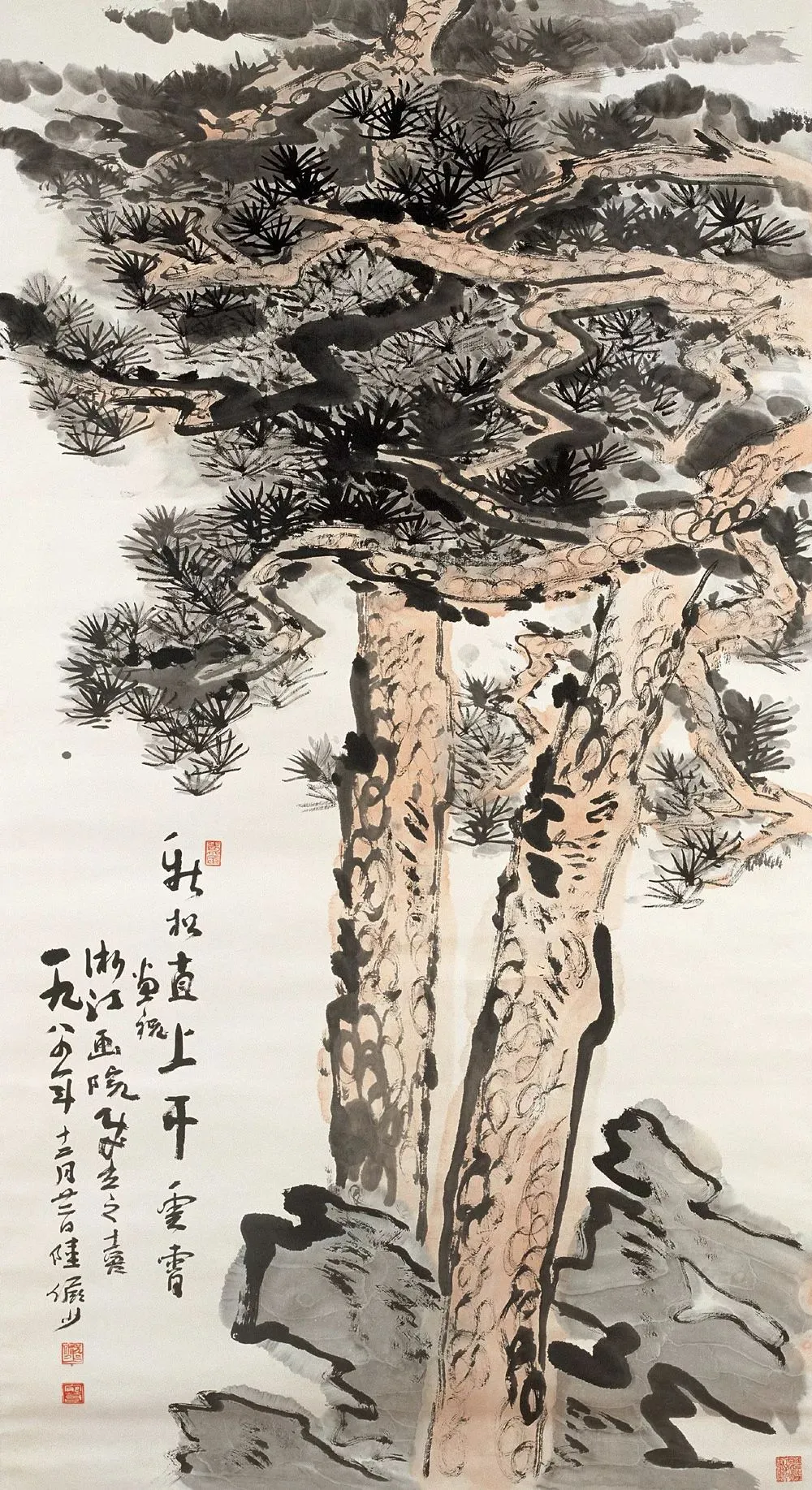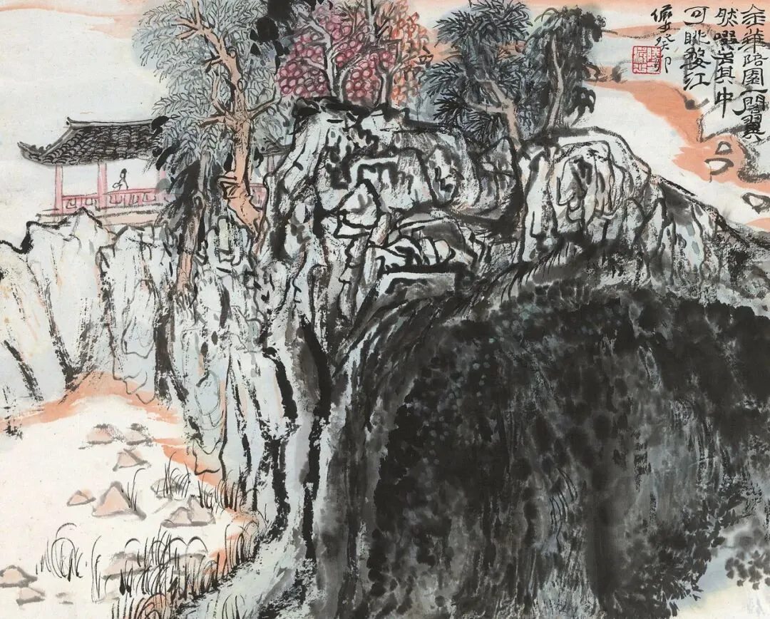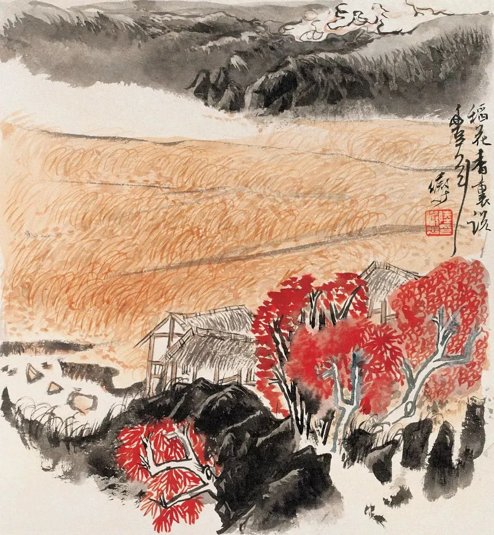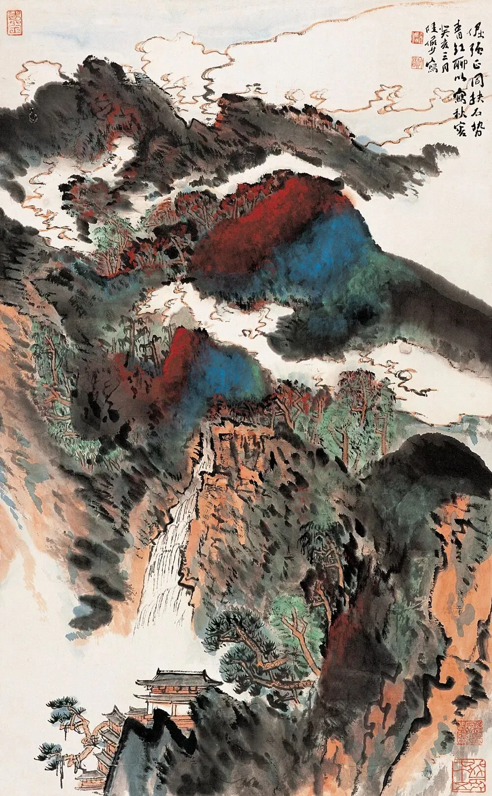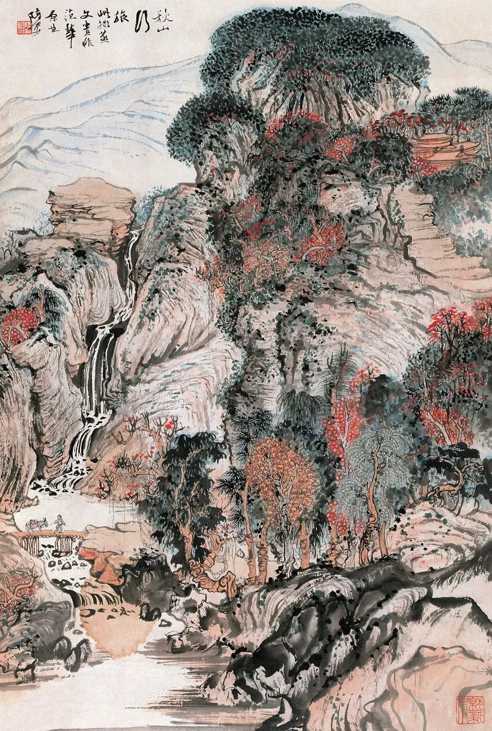 “自由”及“多变”是以表现技法与表现程式的多样性、丰富性为基础的。他山水画的特点还在于形态体制的多样性,内容的极度丰富性。他于各种传统技法兼收并用,无所不擅,不为一派一家所拘,故作起画来,连贯一气,驰骋有余。他是文人画家,师法董源、巨然、“元四家”及董其昌等。如他画水就广泛研习古代画水方法,加以变通,得以随心所欲地画出水的千姿百态。他画树初从“四王”入手,后学习元人,最后以北宋诸大家为宗。画山石从董源、巨然、“元四家”及董其昌入手,以披麻皴为主,又喜王蒙细牛毛皴,求笔墨意趣。他不鄙北派山水画,大胆借用李唐等刚劲利索、大刀阔斧的皴法于画中。他使用的皴法极多,并能将各家各派技法巧妙结合。他在回归笔墨根本的同时他又克服了山水画发展到明清时期积存的诸多弊病, 解决了山峦结构脉络及空间层次表现等许多问题, 然后再把笔墨内涵的开掘作为重心, 创造出许多全新的表现手法。他的艺术语汇勾、染、皴法, 对于云水的独特勾勒表现方法, 对于山石的皴法, 都是自出机杼, 独成一家, 这样笔墨就具有扎实的形体依附, 形体又具有生动的笔墨充实, 使山水的形体结实、章法稳健, 却又无处不飞动, 毫无板滞之感, 从而脱略了传统松、散、浮、乱等俗气, 走出了有笔墨而无形体的水墨游戏怪圈。所有这些语汇都会聚生成为一种全新的境界, 陆俨少的山水画的特色首先是对于动态美的表现, 烟云流动、波澜壮阔, 无处不无动感, 他笔下的山水形象使人感觉到天地大自然皆在律动之中, 呈现出全新的风格面貌。陆俨少用笔精湛,但他的用墨同他的用笔交映生辉,毫不显弱。特别是晚年,用墨愈见新奇大胆,在风格图式创新及意境开拓上起到了比用笔更大的效应与作用。继以大墨块留空隙为云后,他又以大墨块施于山石树木间,使之愈见整体明快,令人耳目一新。因而云与水交合互动,再与墨块交错互融,浑然一气。他的创作自由达到了无可复加的境地,而其山水画也随之达到了炉火纯青的地步,以独特崭新而强烈的表现形式和超越前人的山水画意境,开创了独树一帜的艺术风格。他笔下的云水变幻无穷、姿态万千,无论从何种角度审视,都具有极高的审美价值。陇上黄云稻熟天 135cm x 66cm 1964年稻花香里说丰年 25cm x 23cm 约20世纪60年代富春新貌图 69.5cm x 38.5cm 1973年辛弃疾词意图 71.5cm x 45cm 约20世纪70年代雁荡泉瀑 71cm x 34cm 约20世纪70年代重岩积雪图 57.5cm x 29.5cm 约20世纪70年代硃砂冲哨口 140cm x 68.5cm 约20世纪70年代新松直上干云霄 180cm x 97cm 1984年