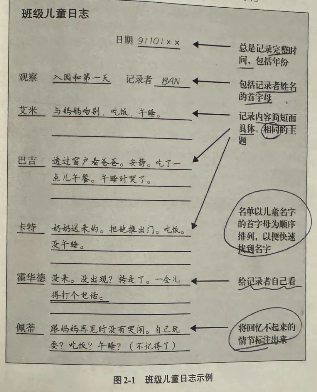 3️⃣班级儿童日志: 是一种能够记下当天每个儿童在园表现或其中几个片段的方法或模式。(用来记录群体中每个儿童某一方面的具体信息的方法)