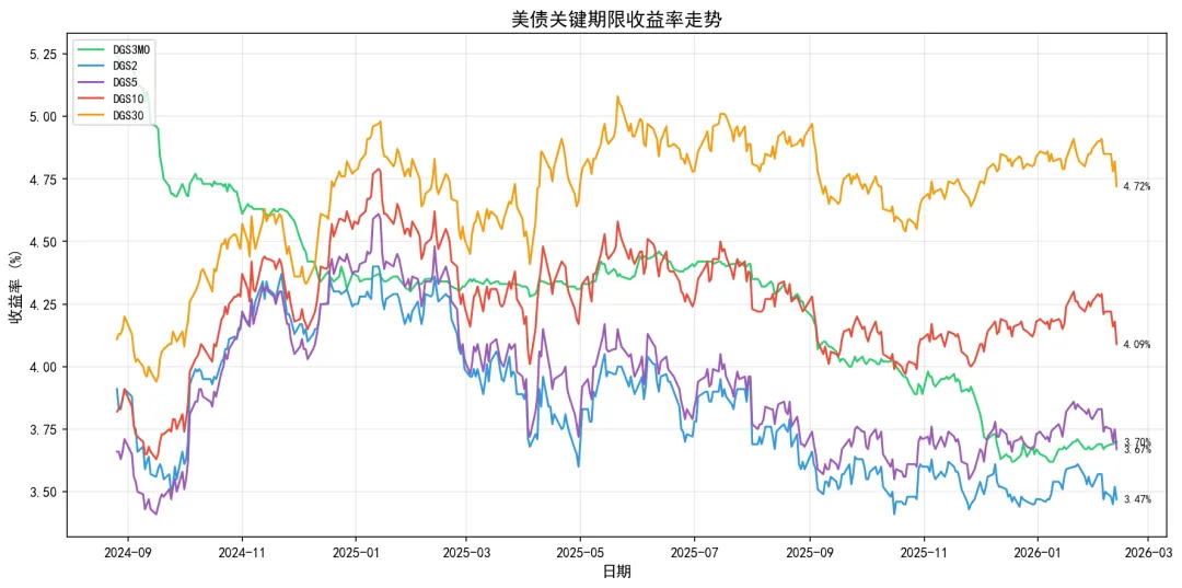 美国2年期国债收益率(DGS2):3.47|看政策利率预期端的变化;短端上行通常意味着市场在上调联储路径。美国10年期国债收益率(DGS10):4.09|看增长/通胀/期限溢价;长端上行对久期资产压制更明显。