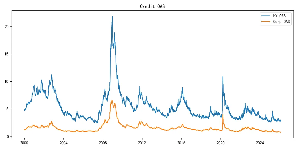 - HY/IG 利差给出信用风险温度;NFCI 给出金融条件的综合变化。