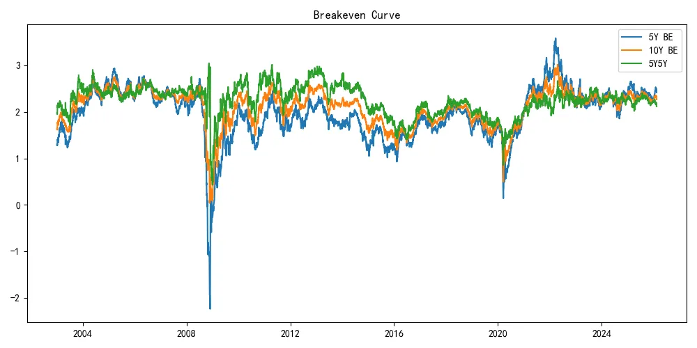 - 把实际通胀(CPI)与市场定价(Breakeven)放在一起看背离与修正风险。