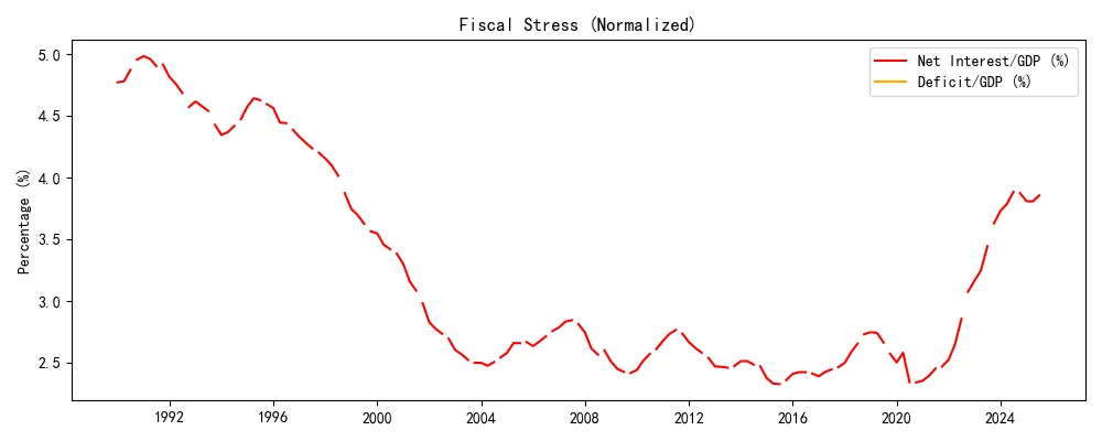 - 债务/GDP、赤字与净利息支出一起看:长期供给压力与期限溢价的中枢变化。