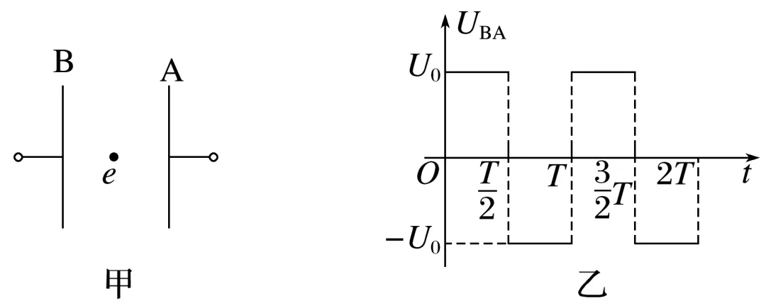 如图甲所示,A、B是一对平行的金属板,一电子静止在两板中间,t=0时刻在两极板间加上如图乙所示周期为T的交变电压UBA,已知电子的质量为m、电荷量为e,两板间的距离为d,电子在运动过程中不与极板发生碰撞,设电子向B板运动方向为正方向。