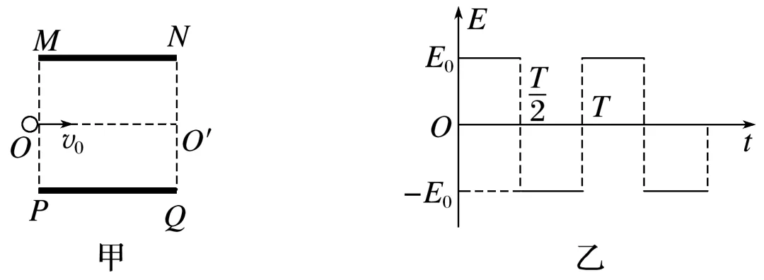 如图甲所示,两平行金属板MN、PQ的板长和板间距离相等,板间存在如图乙所示的随时间做周期性变化的电场,周期为T,电场方向与两板垂直,不计重力的带电粒子沿板间中线OO′垂直电场方向源源不断地射入电场,粒子射入电场时的初速度大小均为v0,已知t=0时刻射入电场的粒子刚好经时间T沿上板右边缘垂直电场方向射出电场。不计粒子间的相互作用,请分析以下情况: